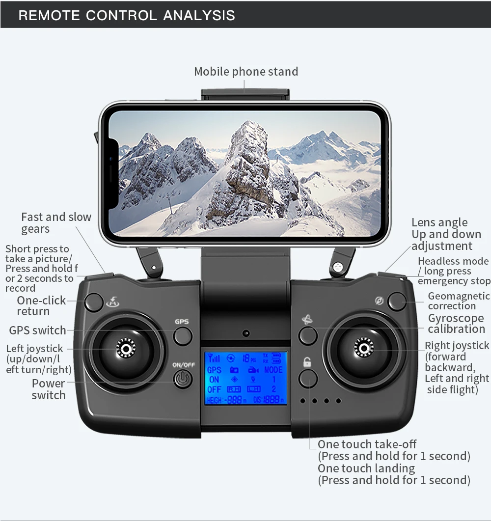 -GPS вспомогательный полет. Предоставляет вам точные детали позиционирования вашего дрона. Дрон автоматически вернется домой точно, когда его батарея Низкая или сигнал слабый, когда вылет из диапазона, никогда не беспокоясь о потере дрона.