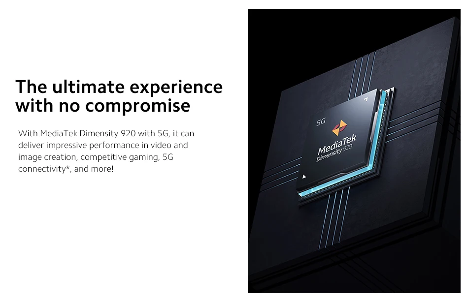 С MediaTek Dimensity 920 с 5G, он может обеспечить впечатляющую производительность в создании видео и изображений, Конкурентные игры, 5G подключение * и многое другое!