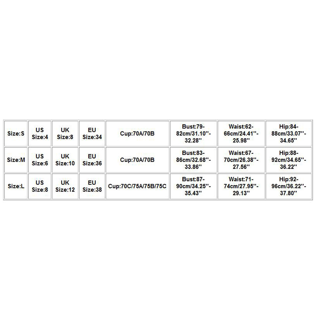 Размеры Американский размер Размер Великобритании Европейский размер Чашка Бюст Талия Бедра S 4 8 34 70A/70B 79-82 см/31,10 ''-32,28'' 62-66 см/24,41 ''-25,98'' 84-88 см/33,07 ''-34,65'' М 6 10 36 70A/70B 83-86 см/32,68 ''-33,86'' 67-70 см/26,38 ''-27,56'' 88-92 см/34,65 ''-36,22'' L 8 12 38 70C/75A/75B/75C 87-90 см/34,25 ''-35,43'' 71-74 см/27,95 ''-29,13'' 92-96 см/36,22 ''-37,80''