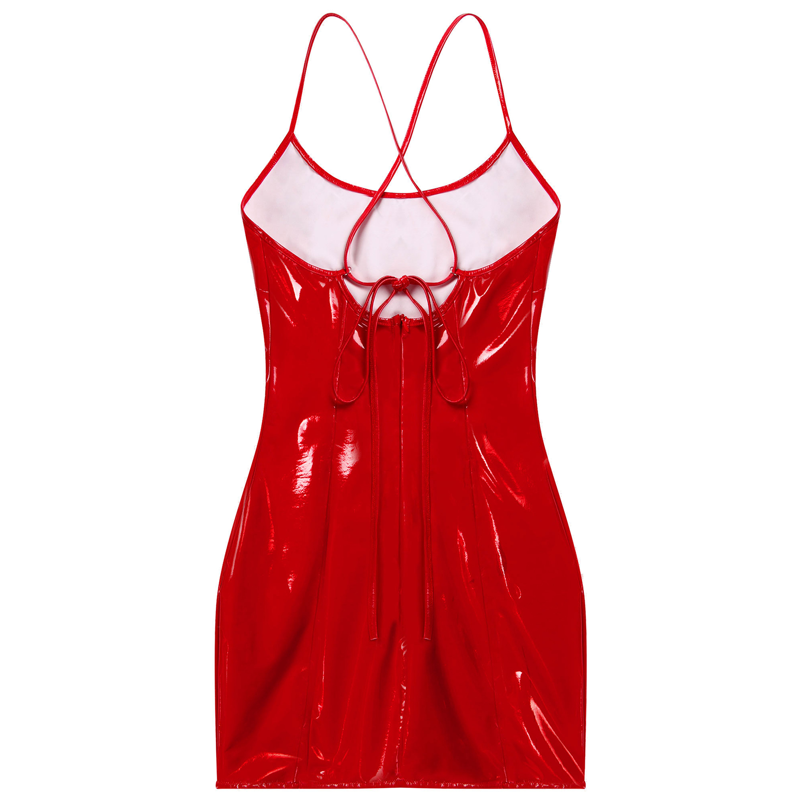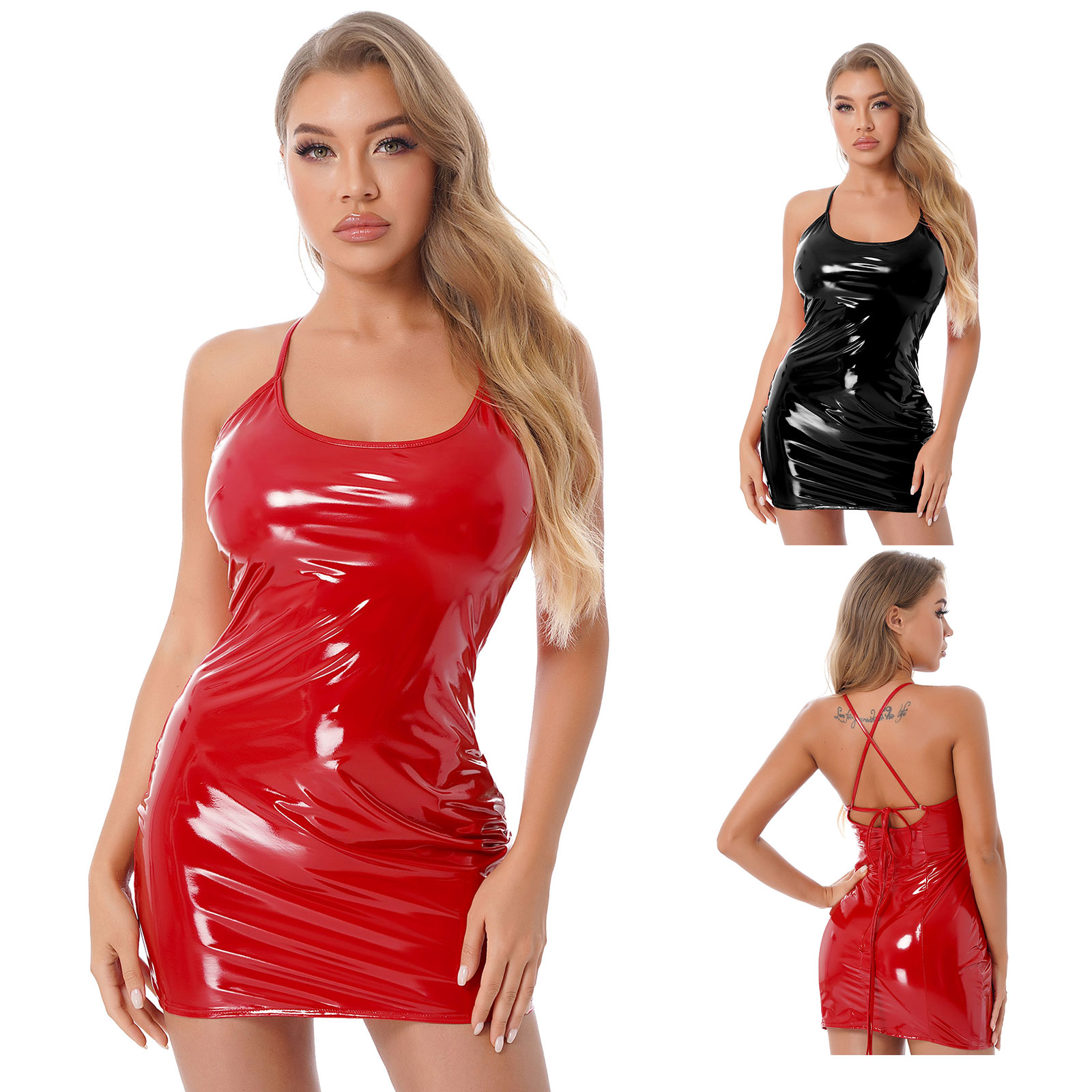 Женское платье из лакированной кожи на тонких бретельках с открытой спиной, на шнуровке, облегающие платья.