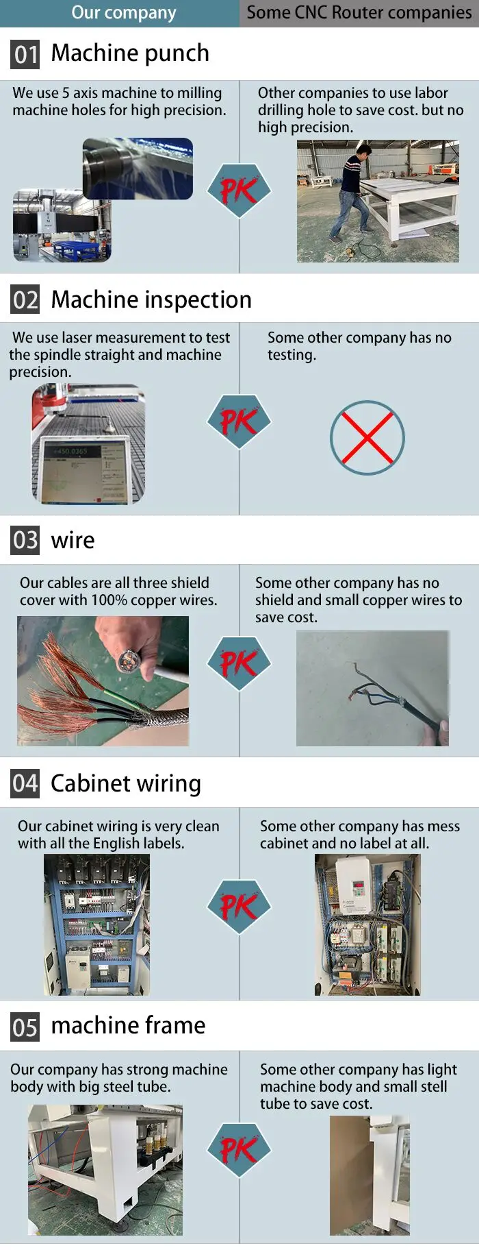 Items Description 1 Travailing size 1300*2500*200mm 2 Working size 1300*2500*200mm 3 Loading and Unloading Speed 15 m/min 4 Transmission X/Y rack and pinion drive, Z ball screw drive 5 Table structure 2 layer vacuum table 6 Spindle power 9.0 KW 7 Spindle speed 24000r/min 8 Travailing speed 80m/min 9 Working speed 25m/min 10 Tool magazine Carousel 11 Tool slots 12 PCS 12 Driving system YASKAWA 13 Voltage AC380/3PH/50HZ 14 Controller Syntec 6 MB