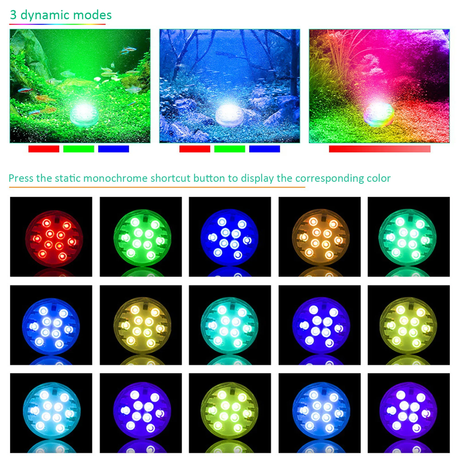 Погружной светодиодный светильник имеет 10 высококачественных светодиодный s, которые будут намного ярче и ярче, чем другие. Его можно легко контролировать с помощью радиочастотного пульта дистанционного управления до 16,4 футов/5 м.