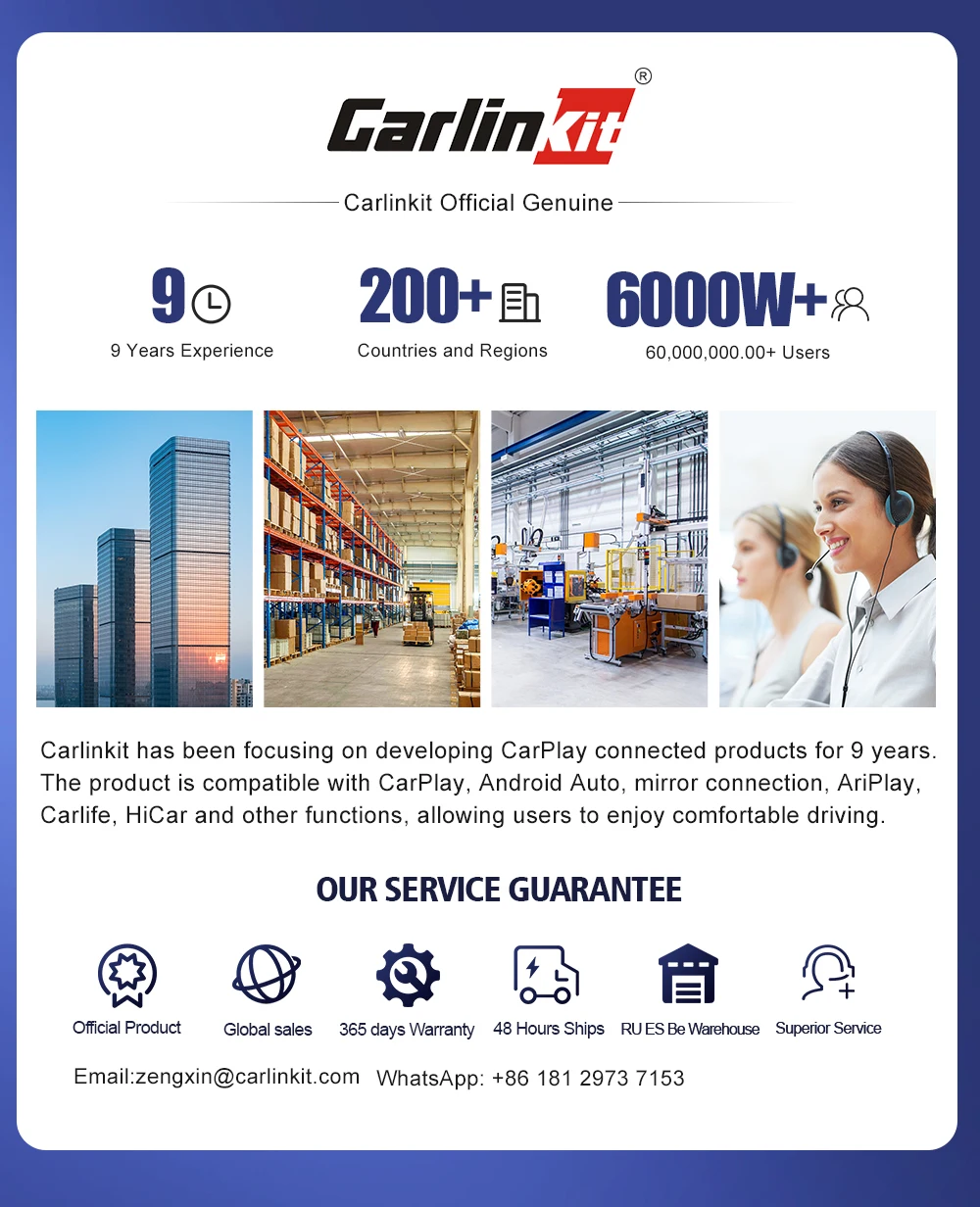 CarlinKit послепродажное обслуживание будет поддерживать вас на протяжении всего. Имеют годовую глобальную гарантию и постоянную техническую поддержку, чтобы обеспечить производительность вашего продукта и пользовательский опыт.