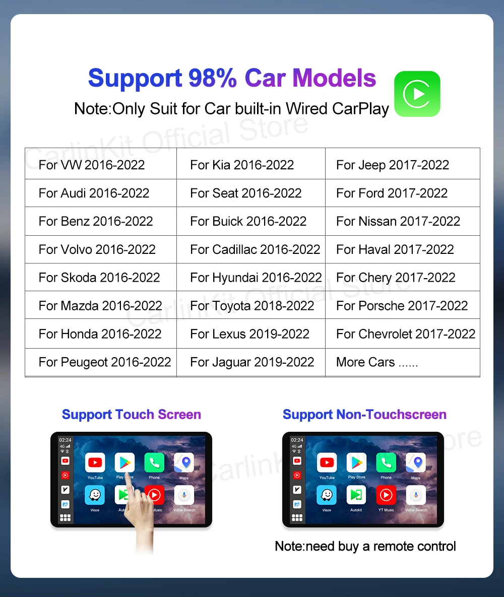 * 2. Пожалуйста, проверьте, поддерживает ли ваш автомобиль проводную Apple CarPlay, ниже на фото есть значок Apple CarPlay на экране автомобиля. Если ваш автомобиль есть, этот продукт будет работать для вашего автомобиля. Спасибо