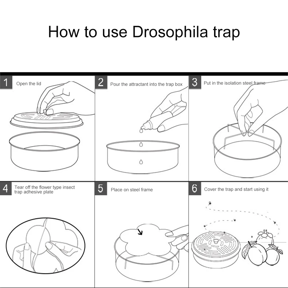 * 3. Простота в использовании: вам просто нужно открыть крышку ловушки для фруктов, положить Аттрактант в ловушку, затем отклеить липкую пасту, разместить ее и закрыть.