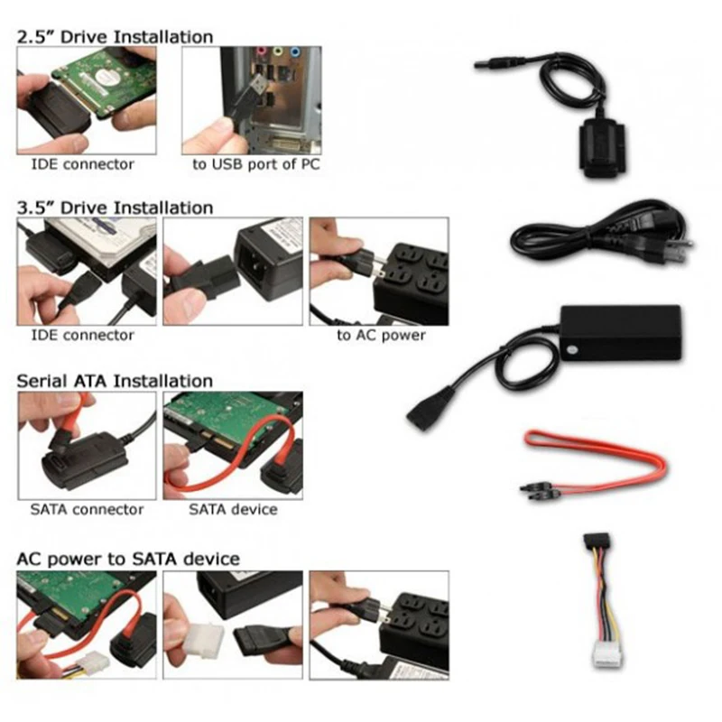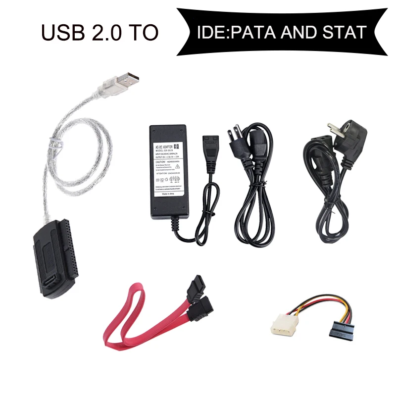 1. USB 2.0 to 2.5" 3.5" IDE SATA HDD Hard Drive Converter Adapter Cable + AC Power Adapter, Supports SATA Hard Disk / ATA/ATAPI CD-ROM/R/RW DVD-ROM (based on ATAPI spec.) External power adapter included, for power up the 5V/12V IDE/ATAPI devices usage.