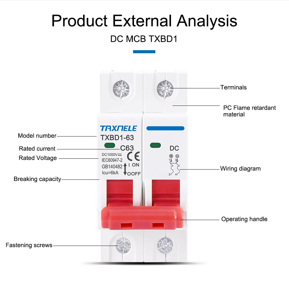 TXBD1-63 Series DC Miniature Circuit Breaker,It is mainly used for the overloading and short circuit protection in DC distribution system and Solar PV System.