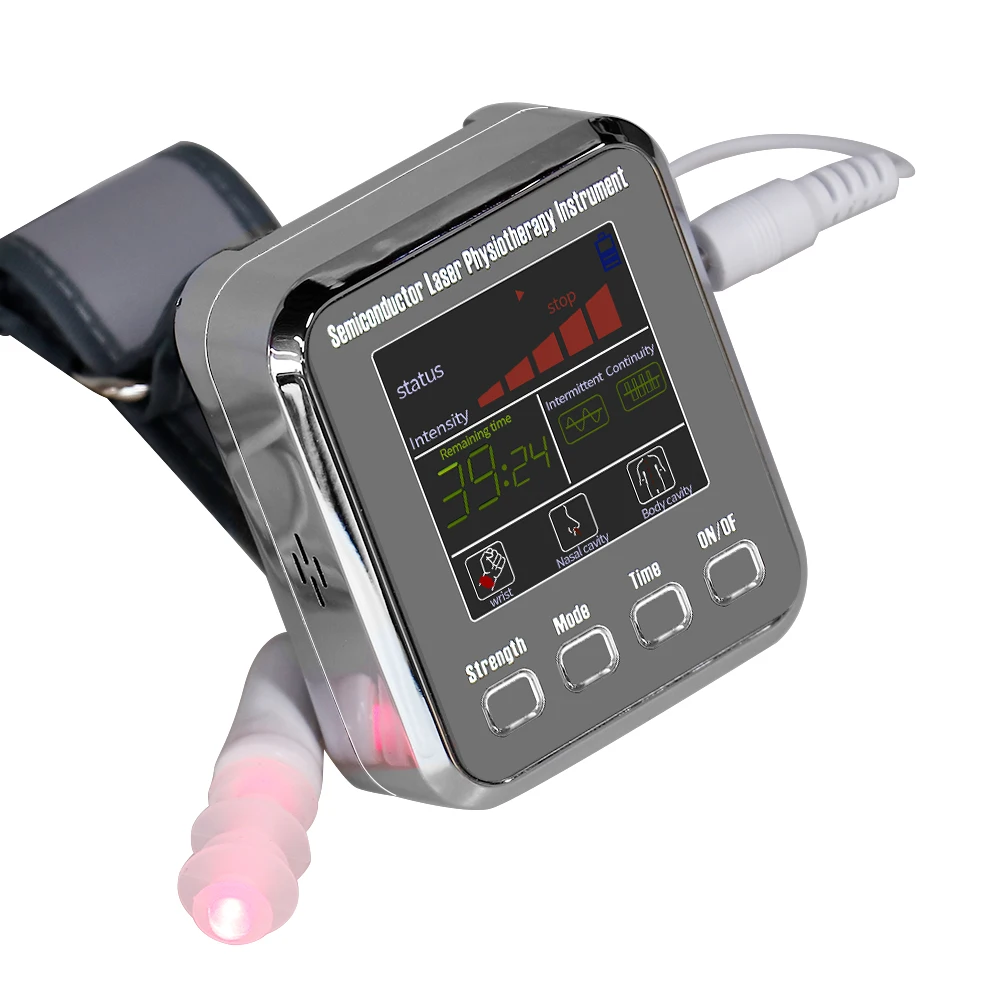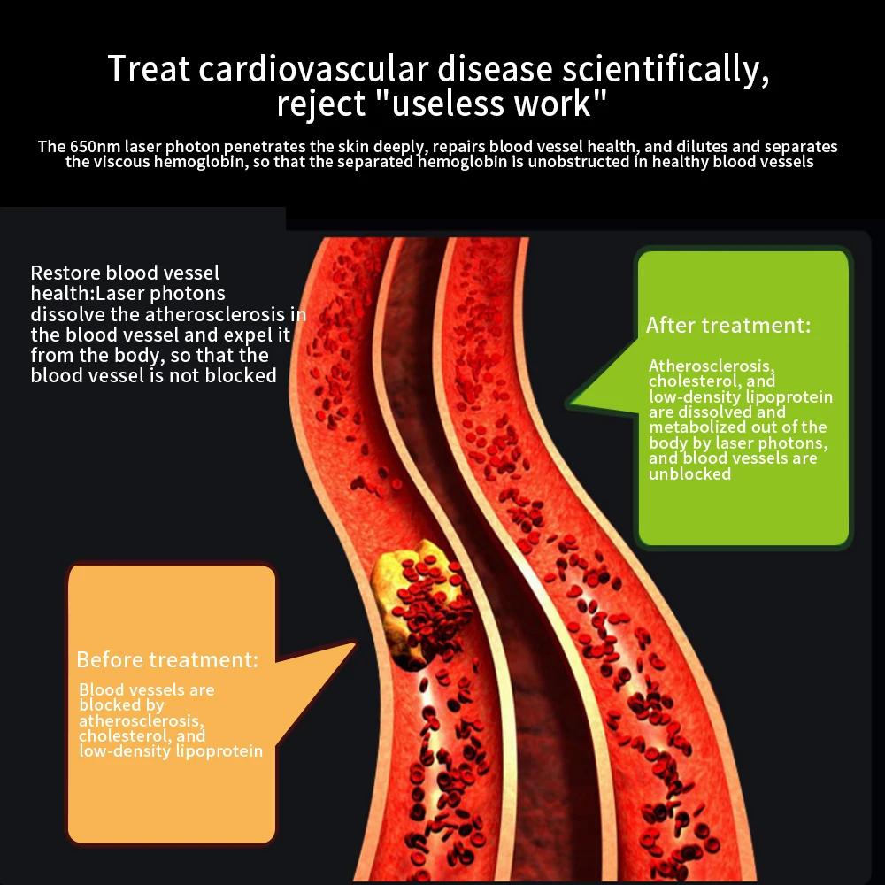 1. Наше устройство принимает лазер 650 нм облучает акупунктурную точку.2. Он проникает в стену нашего судна.3. Мы можем поглощать лазерную энергию для производства липотеиновой липазы, липаза разложит жировой мусор в крови, чтобы улучшить микроциркуляцию.4. Улучшает способность эритроцитов переносить кислород, чтобы очистить кровь или гипервязкость. Улучшите функцию islet, сделайте секрецию инсулина нормальным уровнем.5. Он может снизить гиперлипидемии, гипергликемии, гипертензии. Диабет.Облучение полости носа:1. Наша носовая полость имеет большое количество капилляров.2. Более легко стимулировать носовой нерв. Улучшает кровообращение черепа и всю микроцикуляцию.3. Доставка большего количества кислорода и питания в наш мозг.4. В конце концов предотвращает церебральный тромбоз инсульта, внезапную гибель, сердечно-сосудистые и цереброваскулярные.Как управлять полупроводниковым лазерным терапевтическим инструментом?1. Во-первых, носить только для левой руки (внутри). Задняя часть устройства соответствует первой линии вашего запястья.2. Затем вставьте головку носовой полости в нос в течение 2-3 см и закрепите носовую перегородку.3. Нажмите кнопку ВКЛ/ВЫКЛ, чтобы включить питание.Нажмите клавишу T, чтобы выбрать время. И затем нажмите еще раз вкл/выкл, чтобы начать лечение.(Примечание: Длительное нажатие кнопки вкл/выкл выключит инструмент).Вы можете увидеть, как лазер выходит из фототерапевтического приборного зонда во время лечения.4. Ключ времени также может выбрать режим. Он имеет два modes.mo de A-хост-машины и аксессуары все работают. Режим b-только аксессуары могут работать. Вы можете выбрать, как вам нужно.5. После завершения обработки нажмите кнопку ВКЛ/ВЫКЛ, чтобы закрыть инструмент. Храните в безопасном месте после очистки (аккуратно протрите тканью) головки терапии.6. Если вы выберете другие аксессуары. Вставьте их в гнездо обработки. (эти аксессуары не могут использоваться в то же время.) нажмите кнопку ВКЛ/ВЫКЛ, чтобы начать обработку.Принцип продуктаПринимает лазер низкой интенсивности с длиной волны 650 нм, через неинвазивное облучение кровеносных сосудов человеческого тела (радиальная артерия, Neiguan акупунктурная точка, акупунктура, локтевая артерия и полость носа). Для улучшения гемодинамики, метаболизма жира в крови и сахара в крови через фотохимические эффекты, тем самым улучшая пропускную способность кислорода и деформируемость красных кровяных клеток, Снижение вязкости крови, снижение жира в крови, снижение артериального давления и улучшение уровня сахара в крови, и, наконец, достижение цели лечения гипертонии, гиперлипаемии, сердечно-сосудистых и цереброваскулярных заболеваний.Клинический тест