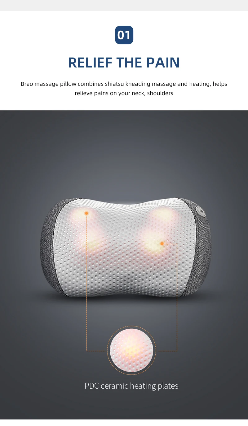 Массажная подушка Breo, сочетающая массаж шиацу и утонченный нагрев, является эффективной в снятии боли и боли в шее, плечах, верхней и нижней частях спины, позвоночнике, талии и т. д. Оригинальный Дизайн Массажного узла обеспечивает умеренную интенсивность для разных мышц.