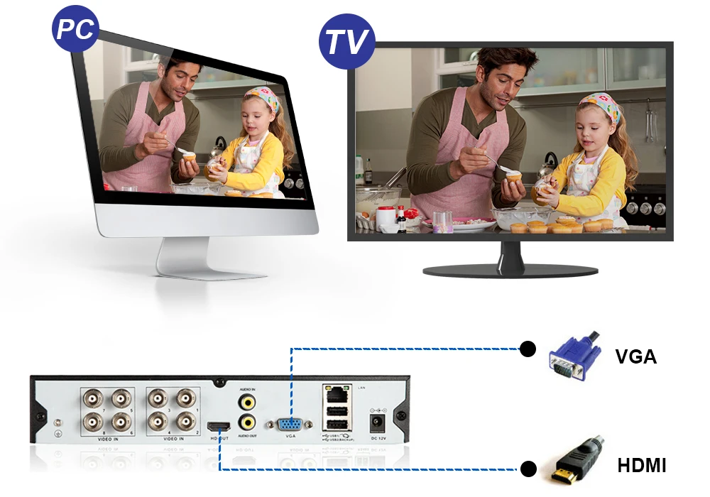 For added convenience, the DVR also comes with VGA and BNC connections for standard resolution viewing options.(VGA or BNC to RCA cable is not included.)