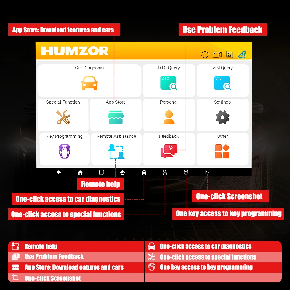 Полностью Обеспечьте вам умную и удобную работу. Быстрый доступ к запросу VIN, запросу DTC, управлению данными, воспроизведению данных, удаленной помощи, значку «Отзывы», скриншоту и т. д.
