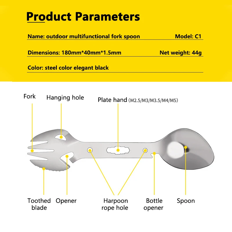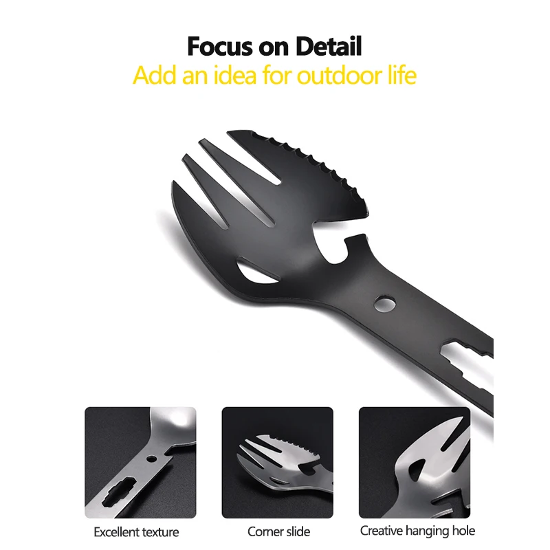 Функция: ложка, вилка, зубчатое лезвие, открывалка для бутылок, отверстие для веревки harpoon, консервный нож,