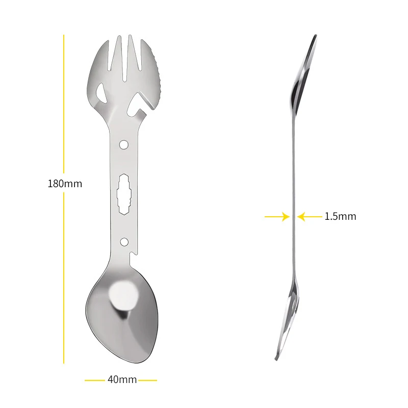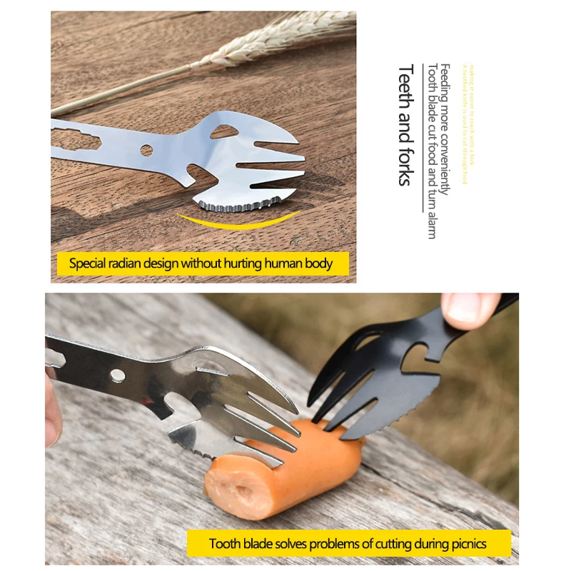 1. Открытый многофункциональный инструмент с консервным баком и открывалкой для бутылок, ложкой, вилкой, идеально подходит для активного отдыха.