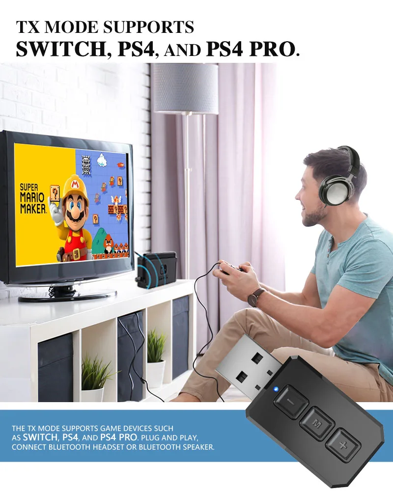 Используйте переключатель, ps4, ps4 pro и другие игровые консоли, аудиокабель не требуется, подключайте и играйте. Звук игровой консоли напрямую передается на bluetooth-гарнитуру.