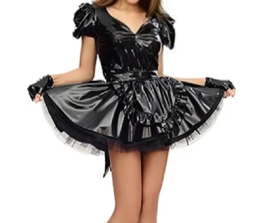 Французский хит продаж, черный сексуальный готический костюм горничной из ПВХ с низким воротником