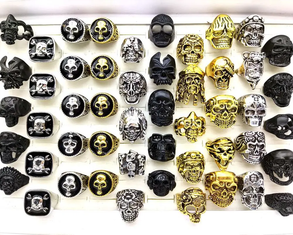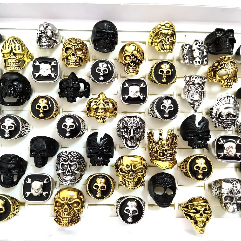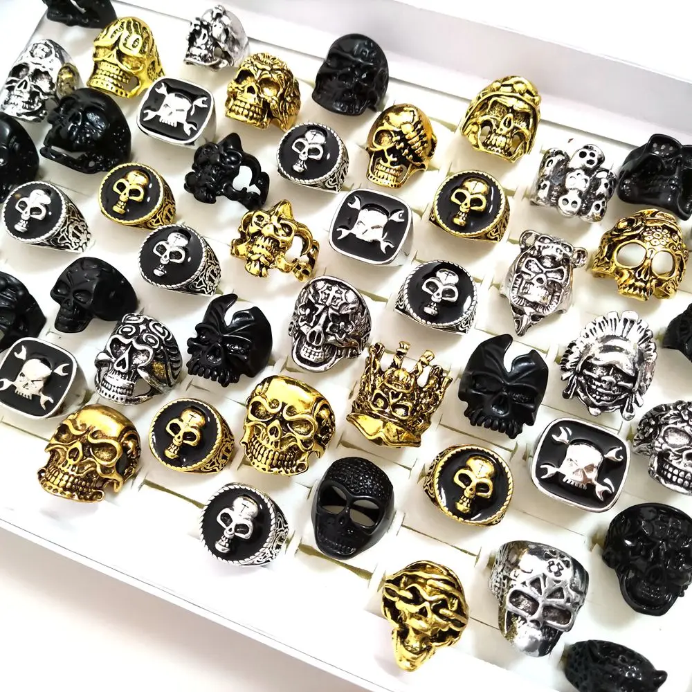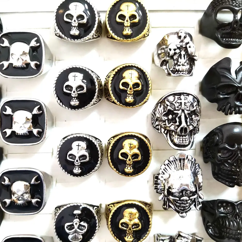 30pcs Big Head Exaggeration Punk Gothic Skull Metal Men Rings Skeleton Biker Rock Party Rings