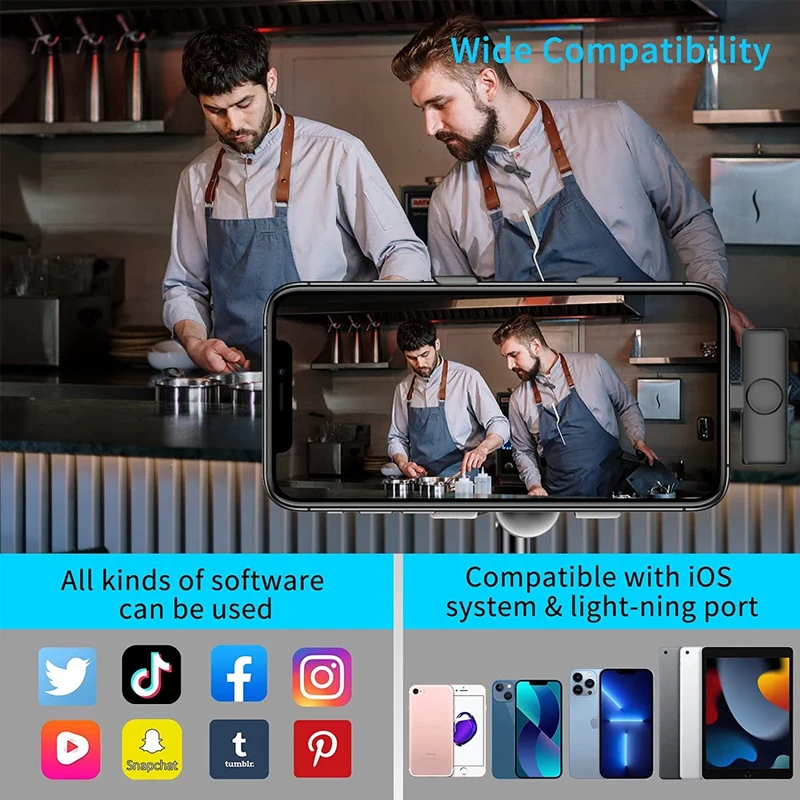 1. Совместим с: петличный микрофон может использоваться с iPhone7 7 Plus, 8 8 Plus, X, XR, XS, XS Max, 11 11 Pro, 11 Pro Max, 12/12 Pro и iPad 2/3/4, серия iPad Air, серия iPadPro (Примечание: Самые последние версии 12,9-дюймов и 11 дюймов iPad Pro с разъемом type-c порты не поддерживаются)