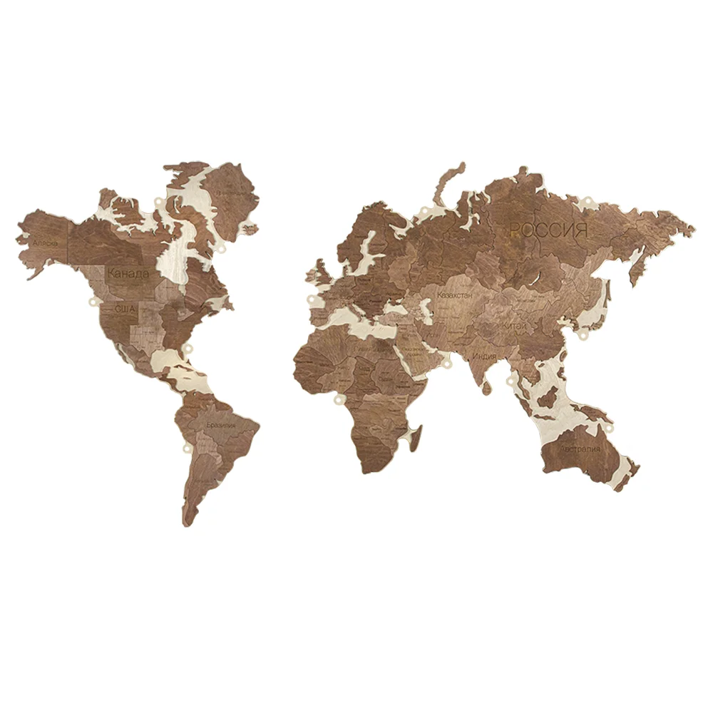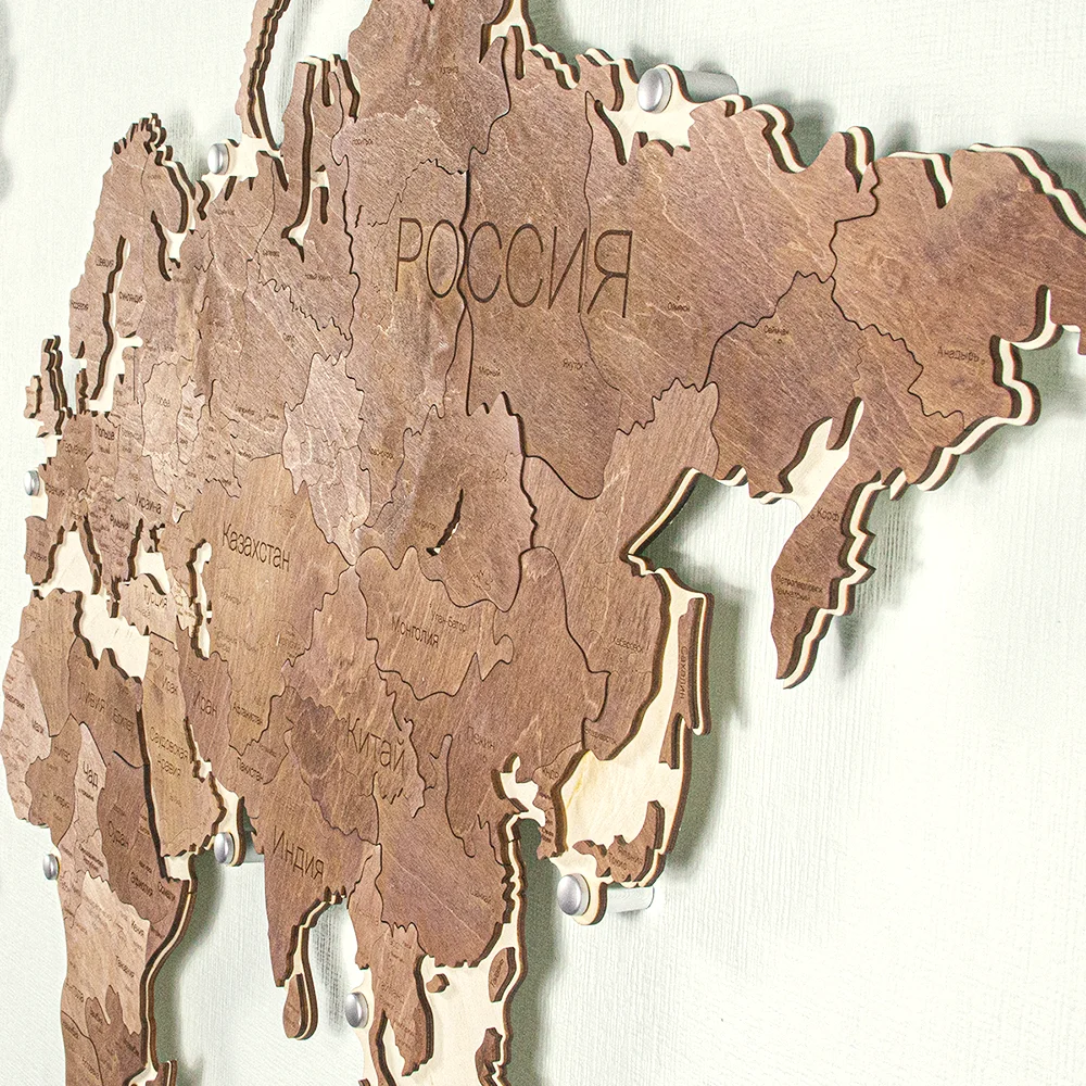 Деревянная подложка придаст фактуру, визуальный объём и упростит сборку карты мира, а вместе с креплением для подложки появится возможность провести подсветку, за счёт расстояния от стены в 2 см, доп элементы добавят эффекта и масштаба.
