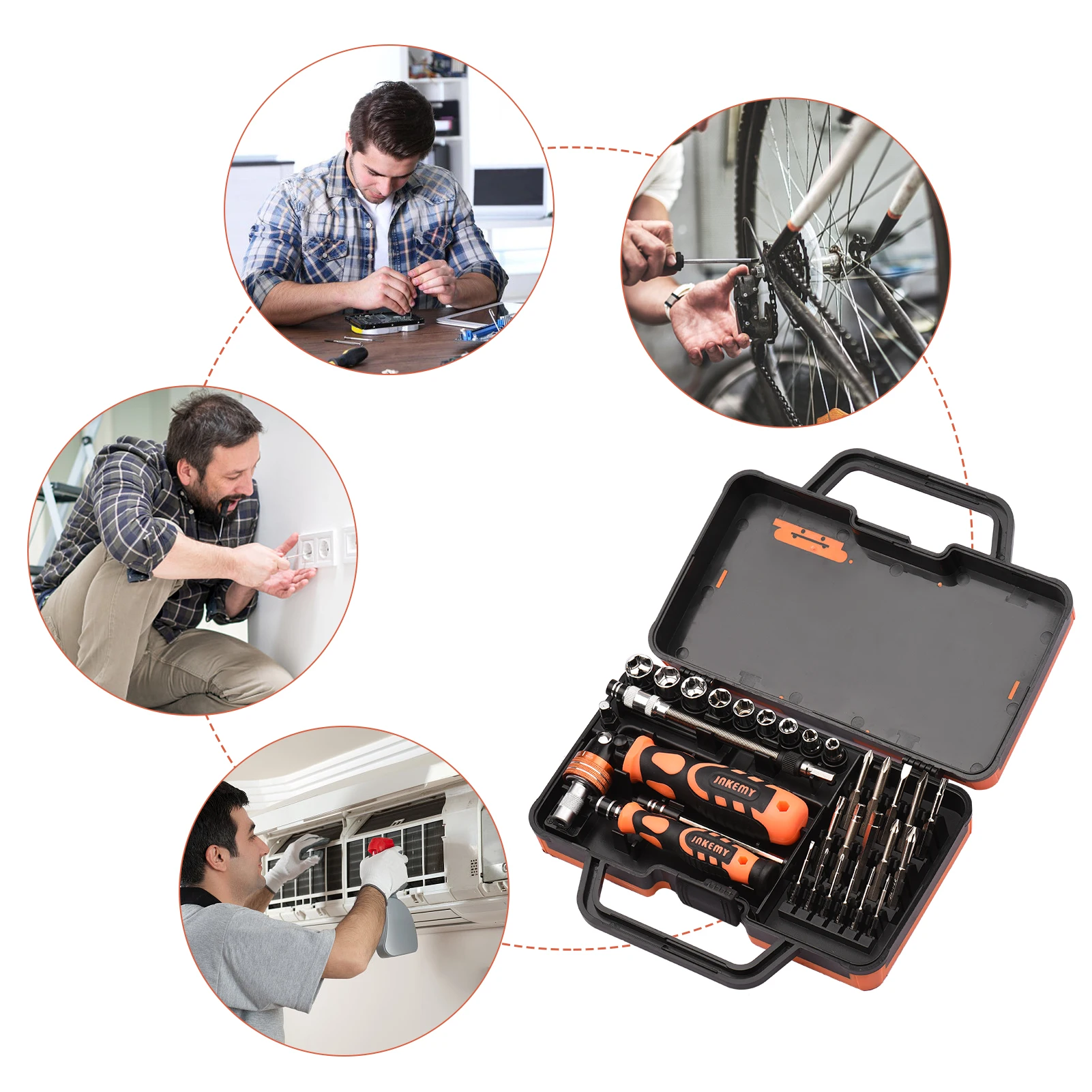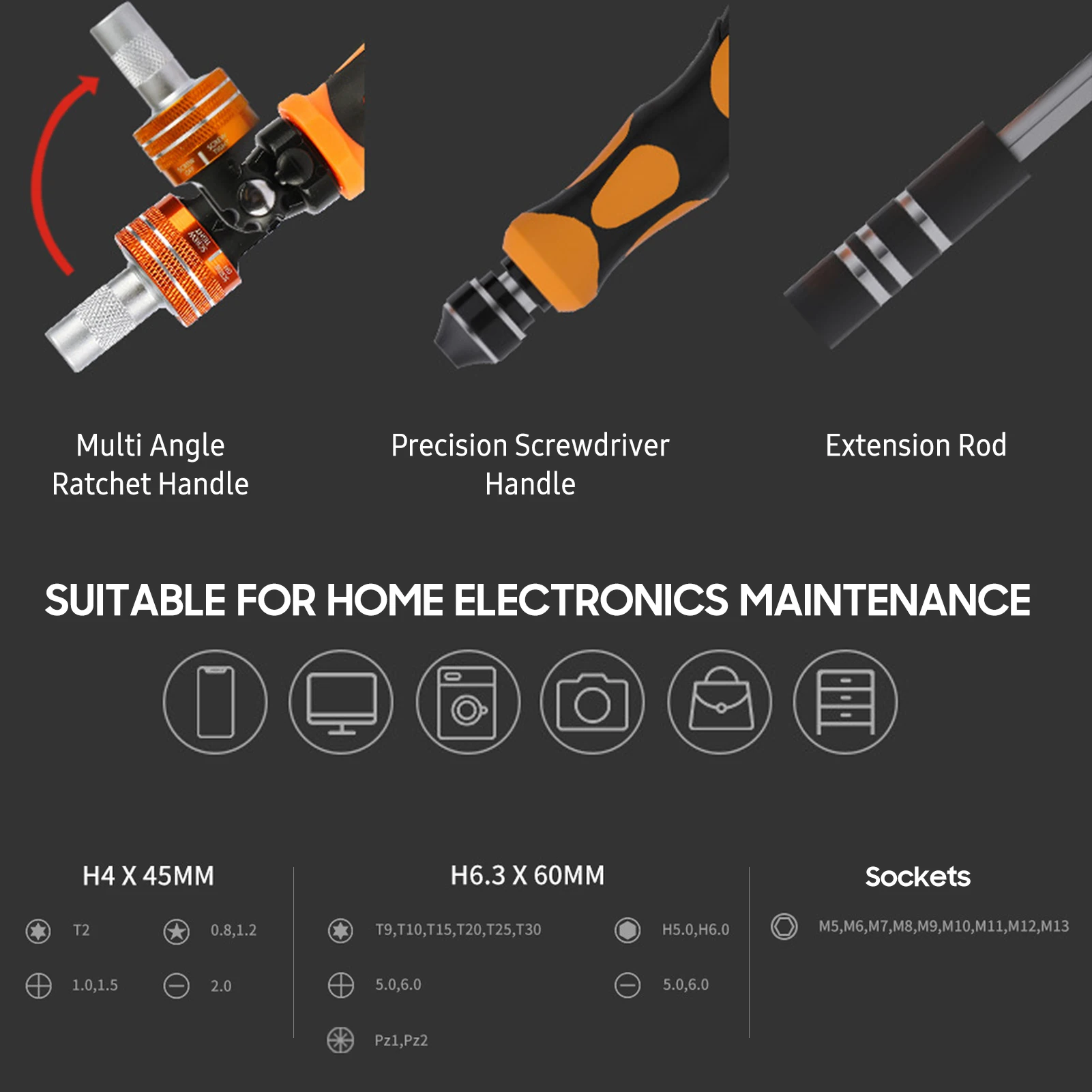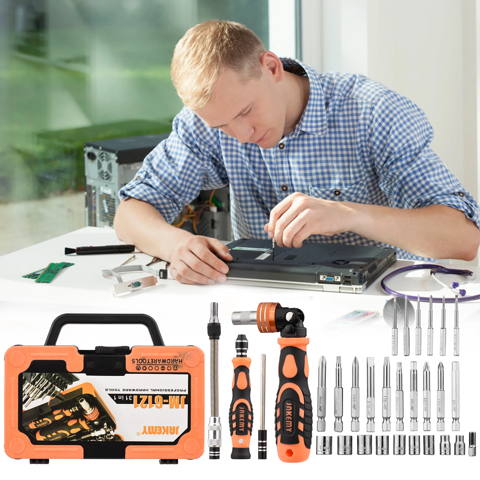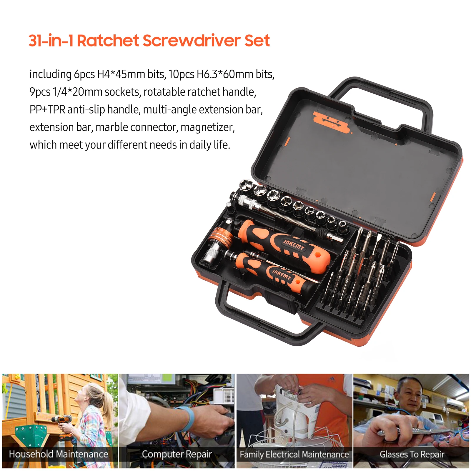 Набор отверток с трещоткой 31 в 1, включая 6 шт. бит H4 * 45 мм, 10 шт. бит H6.3 * 60 мм, 9 шт. гнезда 1/4*20 мм, вращающаяся рукоятка с трещоткой, PP + TPR противоскользящая ручка, многоугольный удлинитель, удлинитель, мраморный соединитель, магнетизатор, который удовлетворит ваши различные потребности в повседневной жизни.