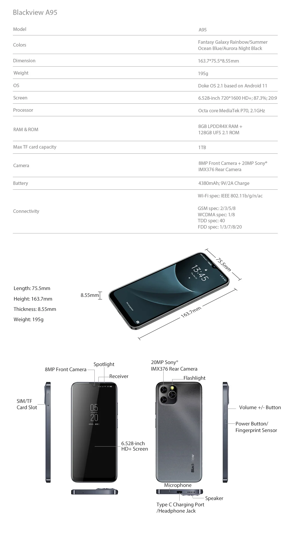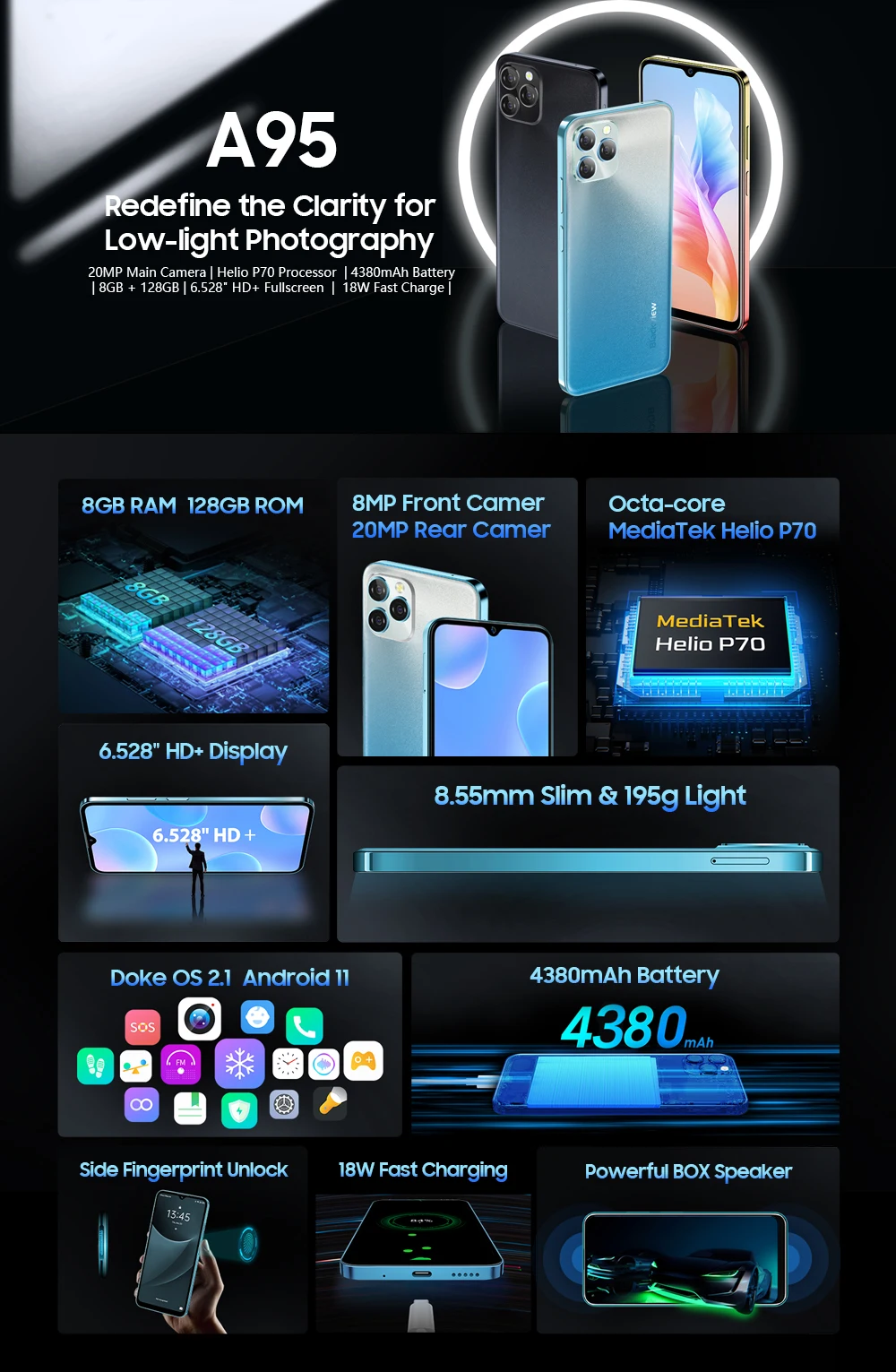 Blackview A95 смартфон Helio P70 Восьмиядерный Android 11 мобильный телефон 8 ГБ + 128 ГБ 6,528 "HD + дисплей камера 20 МП 4380 мАч мобильный телефон