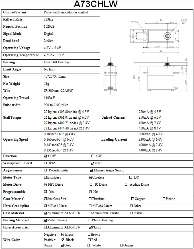 -Рабочая скорость: 0.160 сек/60 ° @ 6,0 В