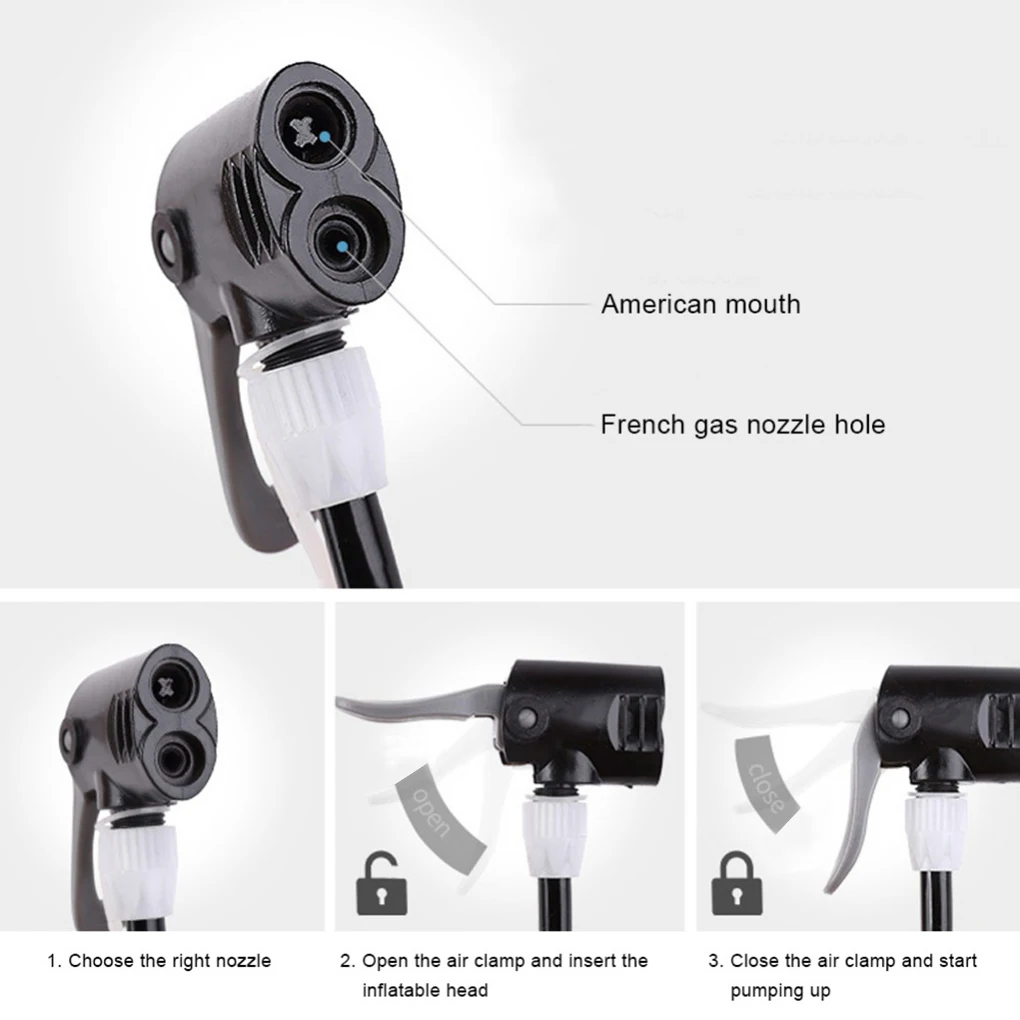 Оснащенный двумя головками, этот велосипедный насос подходит для Шредера и шлангов Presta, достаточно для удовлетворения ваших повседневных потребностей.