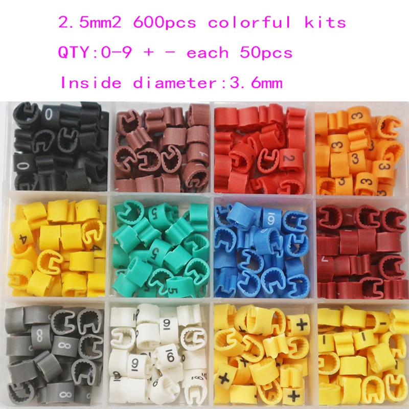 Package: 1.5 and 2.5mm2 is 600pcs/box(0-9 + - each 50PCS. 4 and 6mm2 is 360pcs/box(0-9 + - each 30PCS). 0.7mm2's colofur is 0-9 + - each 100pcs,total 1000pcs.10mm2's colorful kits is 0-9 + - each 10pcs,total is 120PCS);0.75mm2's inside diameter is 2.0mm;1.5mm2's inside diameter is 3.0mm;2.5mm2's inside diameter is 3.6mm;4mm2's inside diameter is 4.3mm;6mm2's inside diameter is 4.5mm; 10mm2's inside diameter is 6.5mm.pls choose the size before u order.