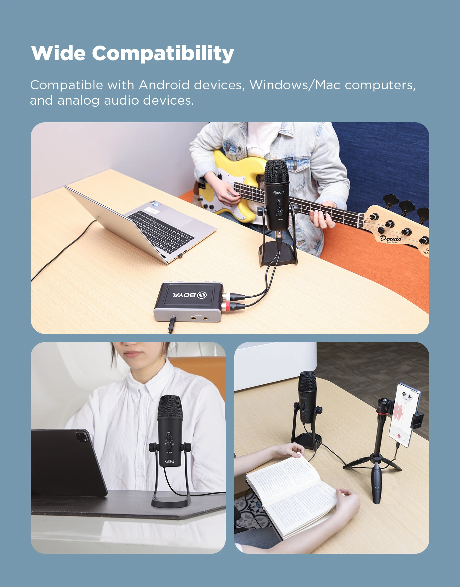 BOYA BY-PM700 Pro-это настольный микрофон с цифровым выходом USB и аналоговым выходом XLR, совместимый с устройствами Android, компьютерами Windows/Mac и аналоговыми аудиоустройствами. Он обеспечивает идеальное аудио решение для домашней студийной записи, подкачки, голосового управления, видеоконференции и многого другого.