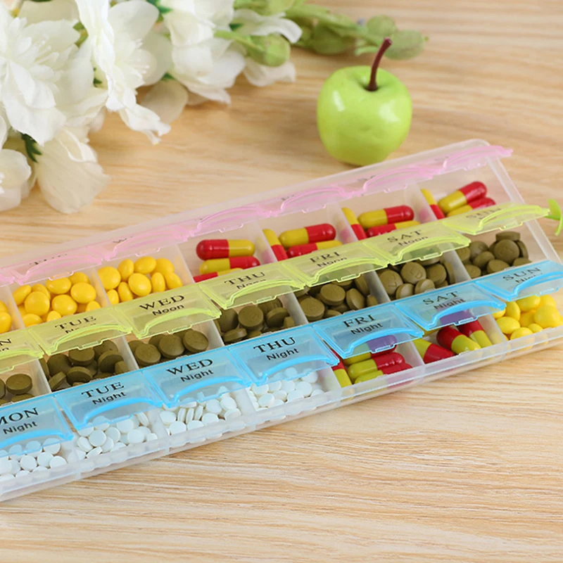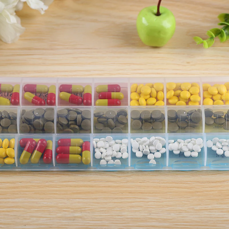 Этот красочный чехол для таблеток позволит вам увидеть на первый взгляд, какой из них вам нужно использовать сегодня. Дизайн цвета радуги делает вашу жизнь более яркой. В общей сложности семь коробок, каждая коробка делится на три небольших коробки. Таким образом, есть 21 сетка, достаточно для использования в течение недели.