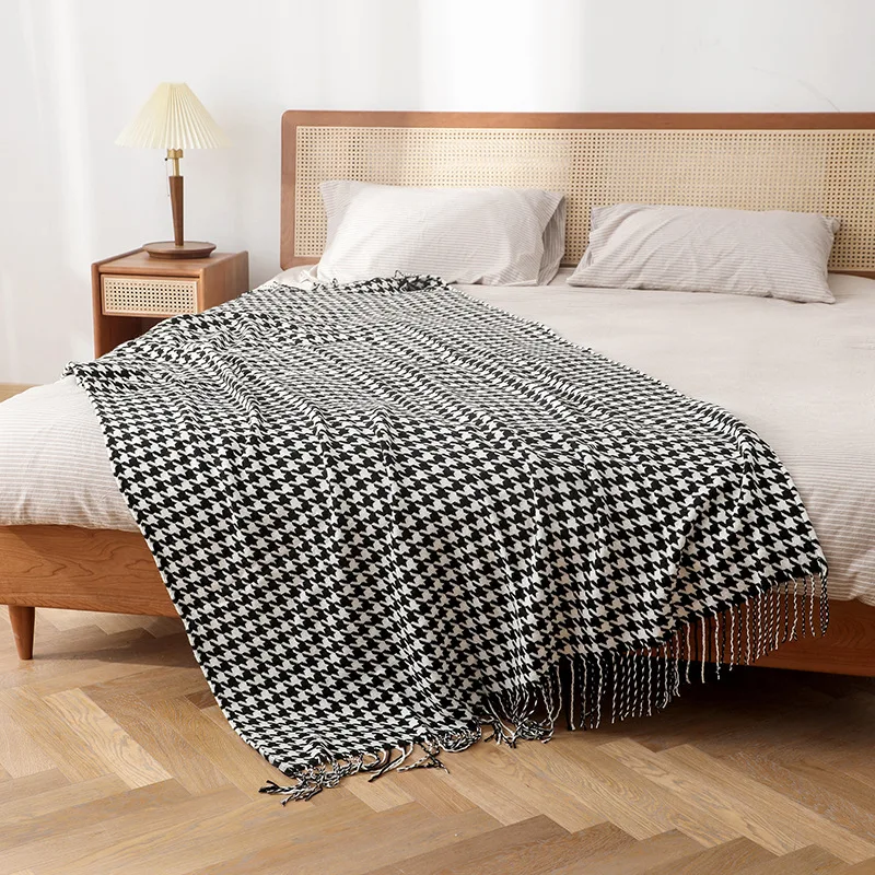 Современное простое одеяло, черно-белое одеяло с узором «гусиные лапки», диванное одеяло, постельное полотенце для отеля, мягкий шарф с кисточками