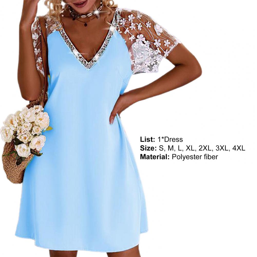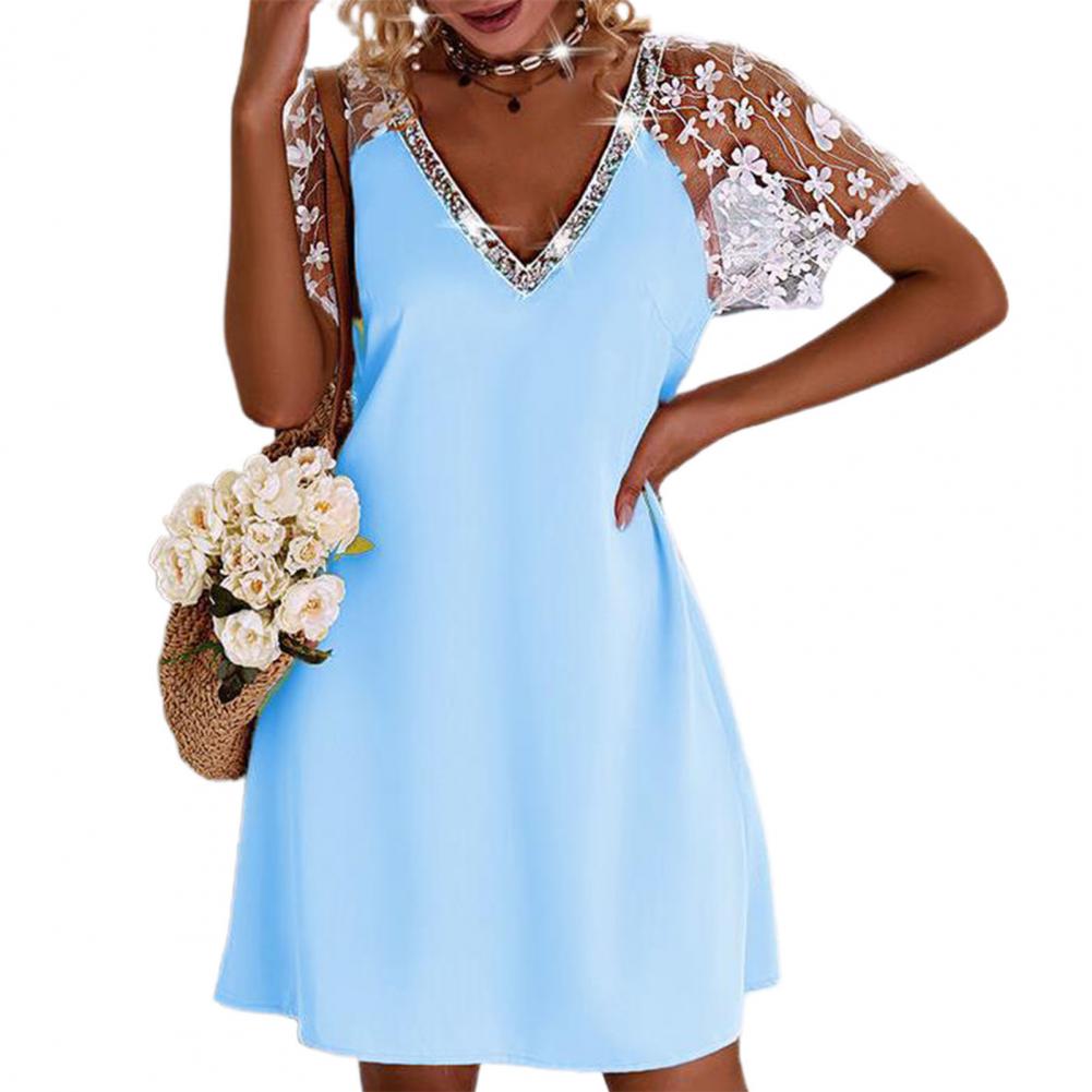 Блестящий дизайн с отделкой воротника делает это мини-платье более простым и модным. Вязанный крючком кружевной рукав делает вас более милым и элегантным в повседневной жизни.