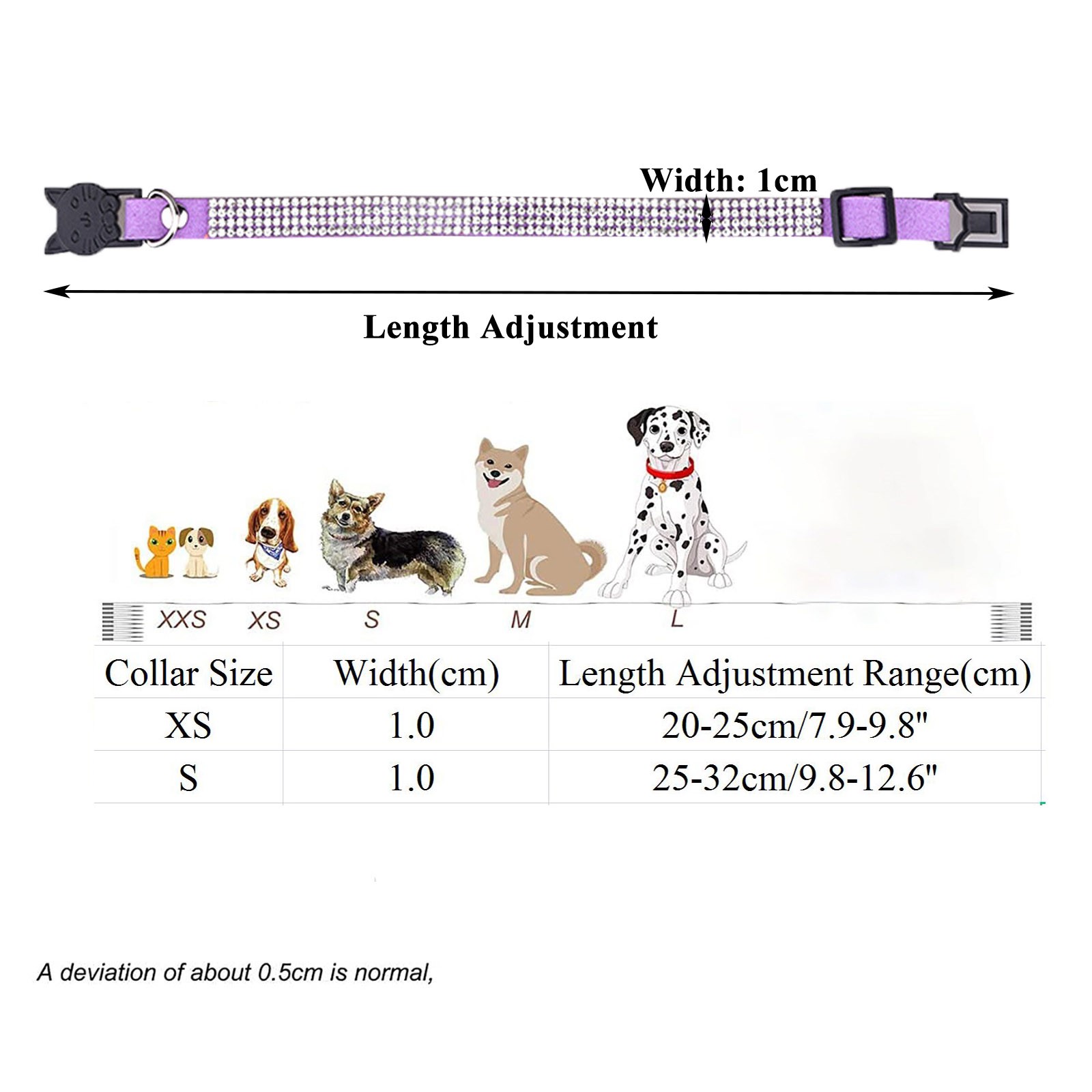 2 регулируемых Стразы воротник размеры XS Регулируемый Длина 7,9-9,8 '', 0,4 дюймов в ширину, S регулируемый Длина 9,8-12,6'', 0,4 дюйма в ширину.