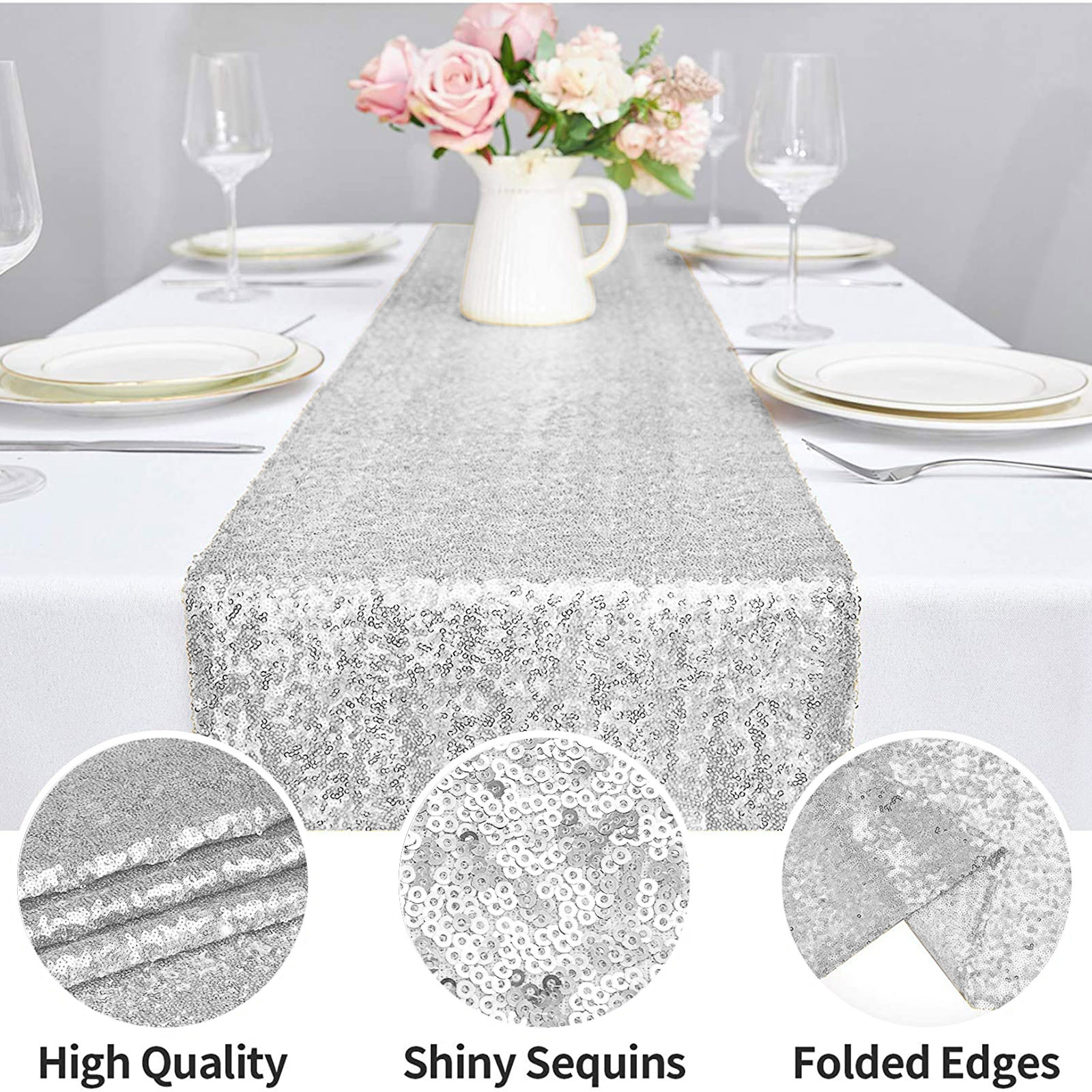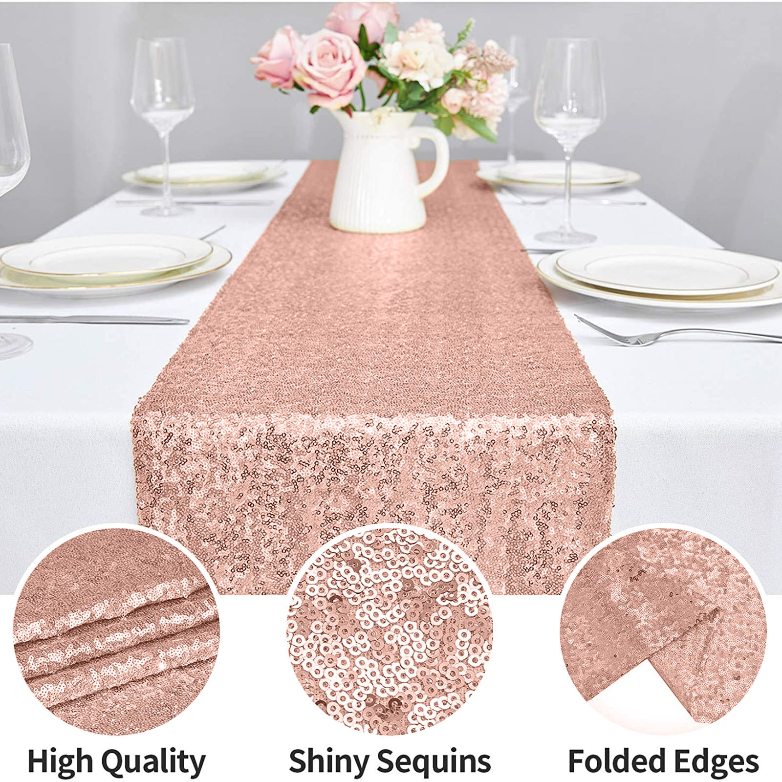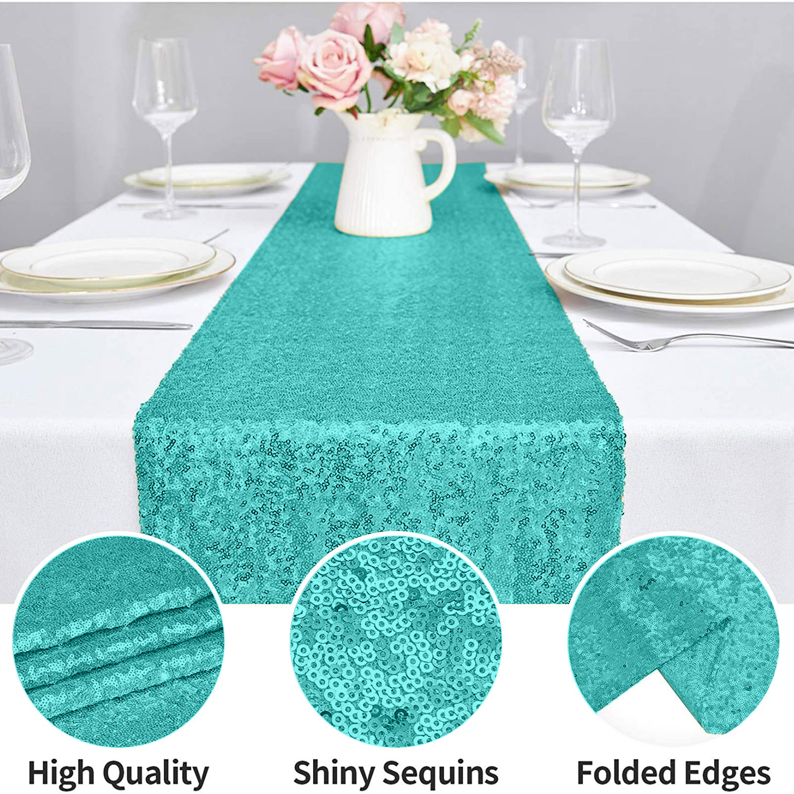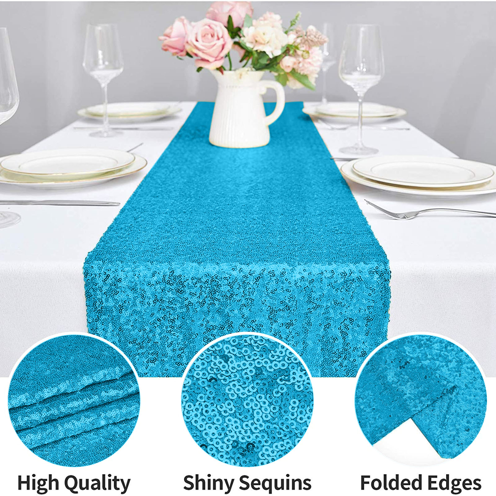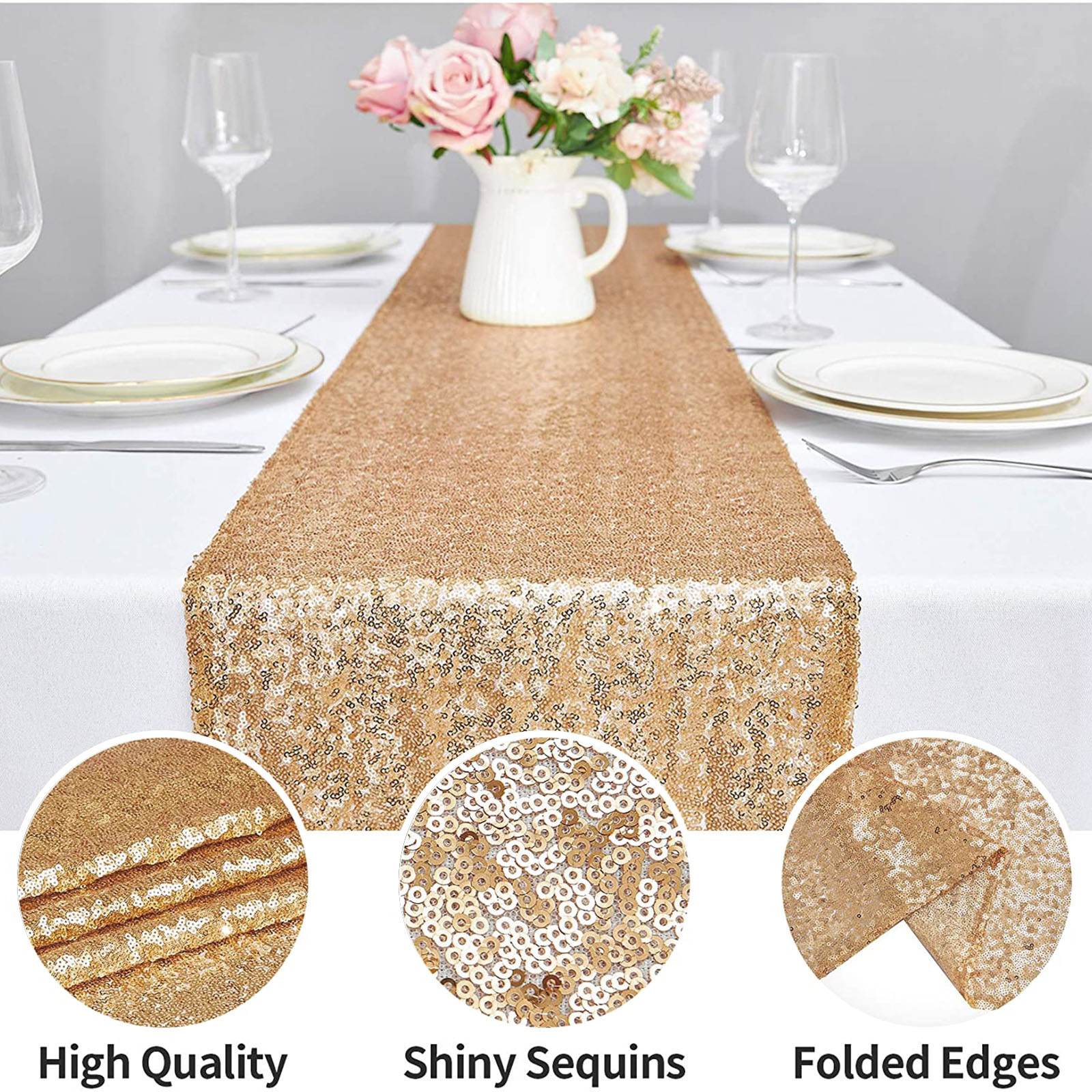 Подходящая сцена: скатерти и скатерти с блестками обеспечивают блестящий эффект под огнями или солнечными лучами, добавляя роскошь и блеск вашей декорированной сцене, делая стол идеальным и добавляя атмосферу к вашему мероприятию. Он используется для праздничных торжеств, банкетов, рождественских праздников, свадеб, свадебных ливней, детских ливней, украшений на Хэллоуин, дней рождения и жизненных событий.