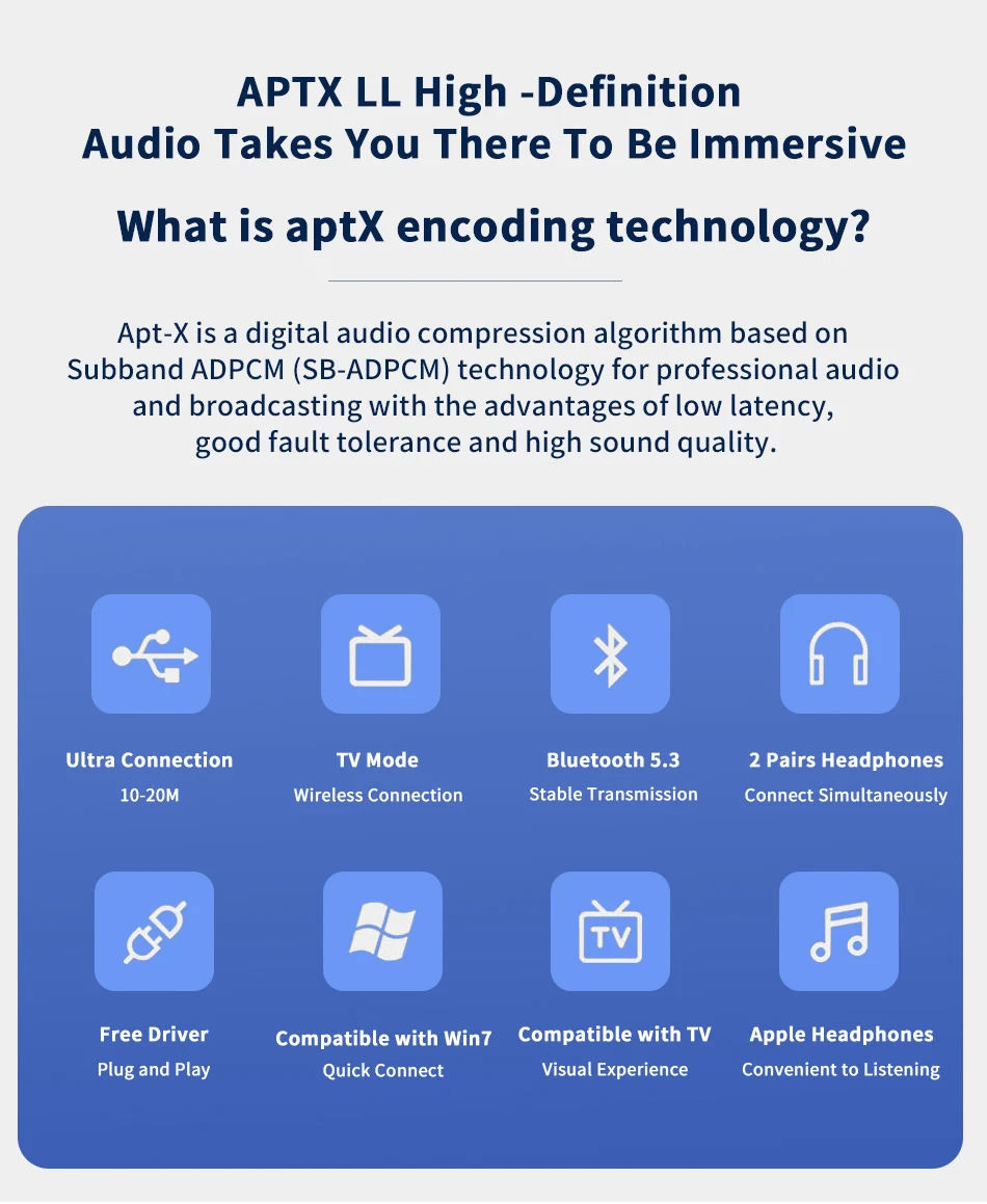 Поддержка Dual stream (режим TX): передатчик Поддерживает одновременное подключение двух bluetooth-динамиков или наушников (с использованием одного и того же кодека), и двойное соединение может поддерживать Адаптивное соединение до aptX