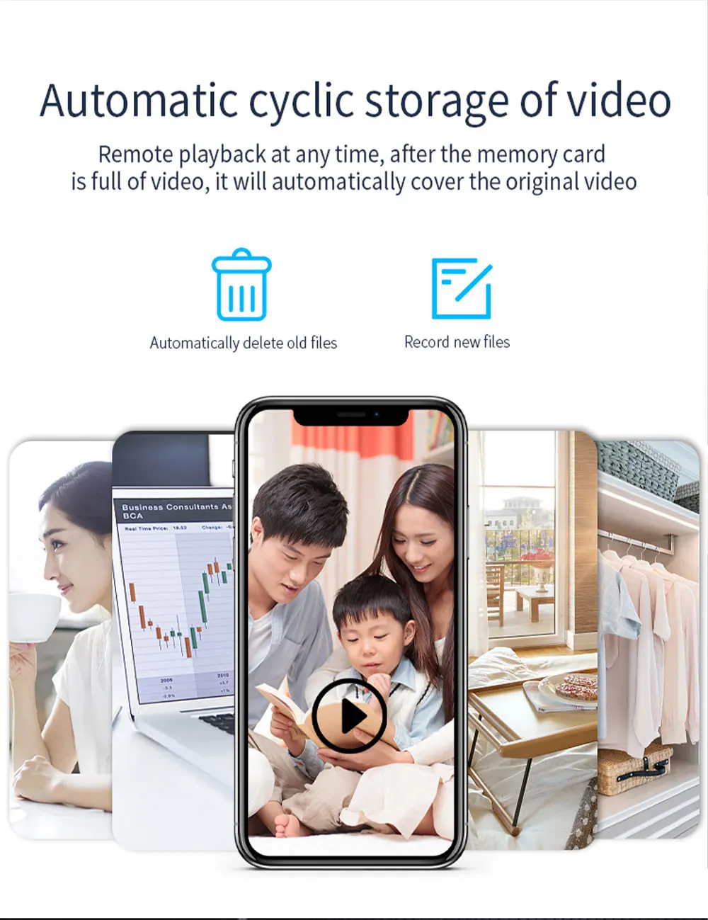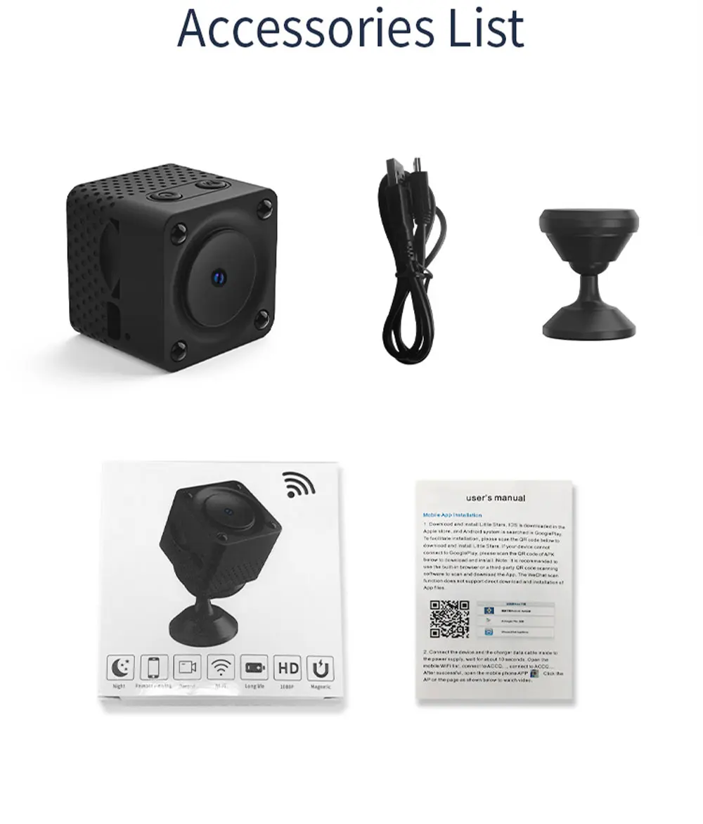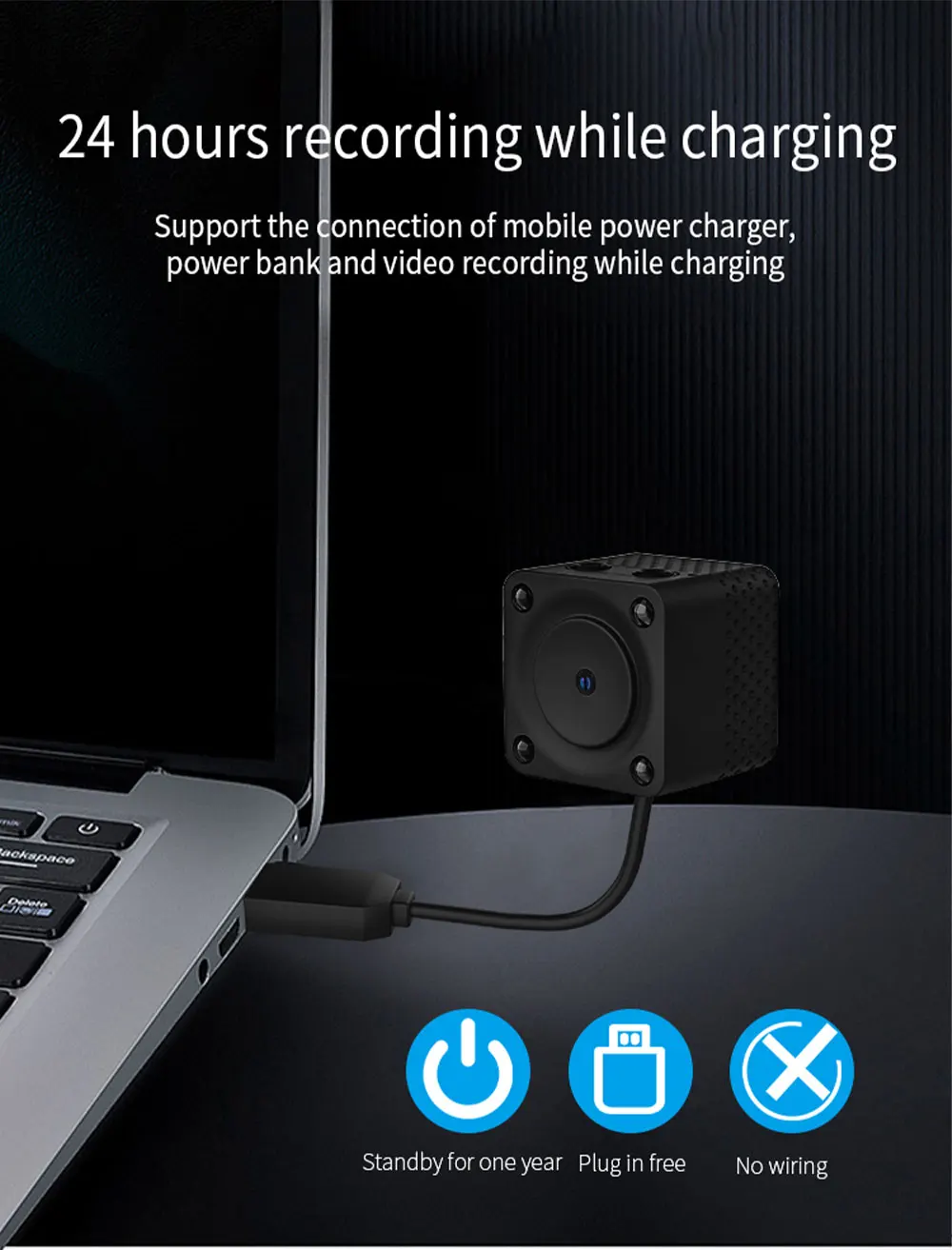 * This small camera bathroom has a built-in magnet, can work well with any iron material, easily place anywhere. This small camera with a rigid charging cable and base, when charging while recording, you can manually rotate the recording angle 360 degrees.