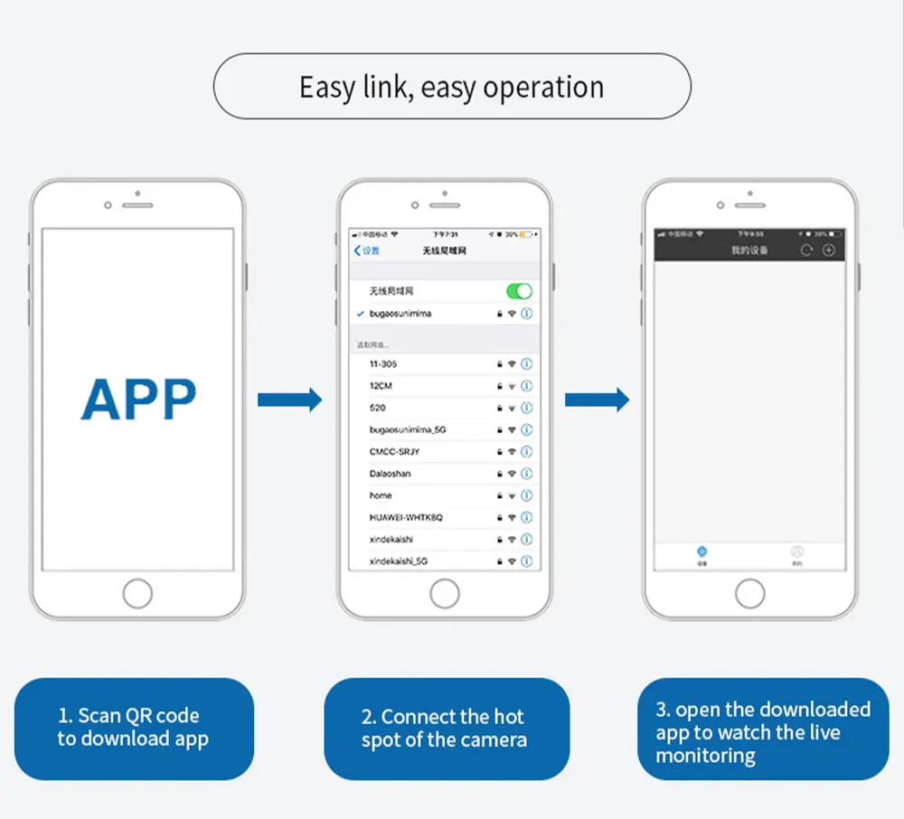 * Find and connect the camera wifi hotspot in your phone WLAN setting. Or, scan the camera QR Code and connect your home 2.4GHz wifi in the App Device Settings-WiFi Config.