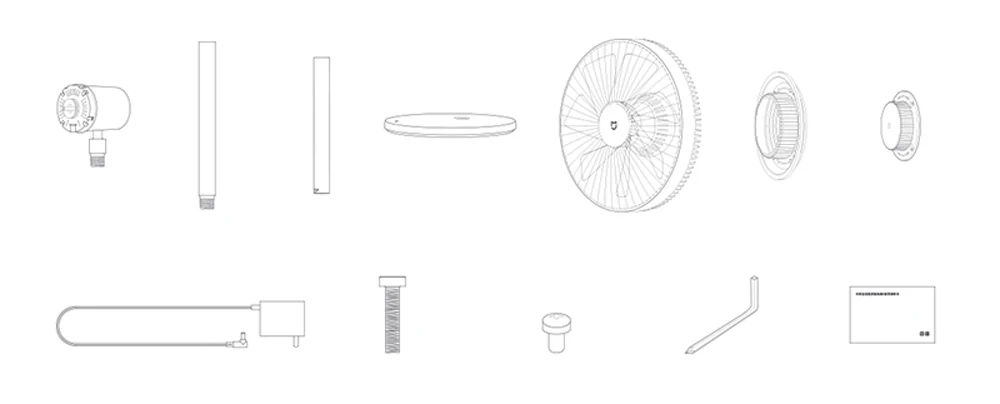 Мотор, верхний столб, нижний столб, основание вентилятора, сборка вентилятора, ручка заднего лобового стекла, ручка лопасти вентилятора, адаптер питания, базовый болт, винт крышки вентилятора, специальный гаечный ключ, руководство пользователя