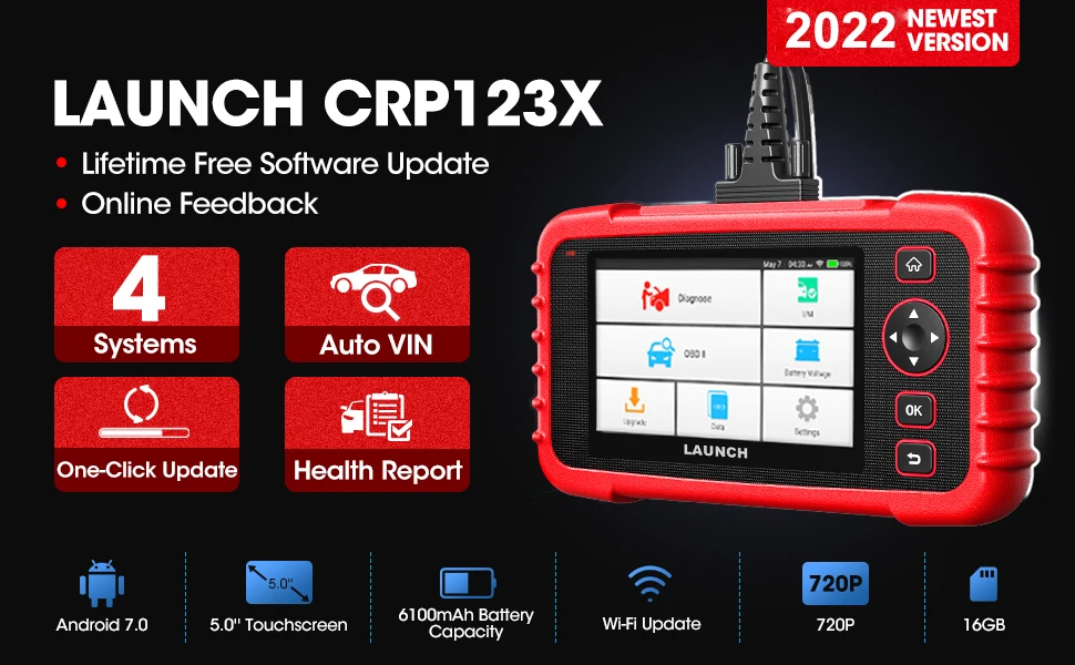 2. Быстрый 7,0 Android Большой 5 "сенсорный HD экран, обновленная память от 8 Гб до 16 ГБ для более транспортных моделей программы. Обновите аккумулятор от 4000 мА · ч до 6100 мА · ч, LAUNCH CRP123X obd2 Scan tool будет работать в течение длительного времени