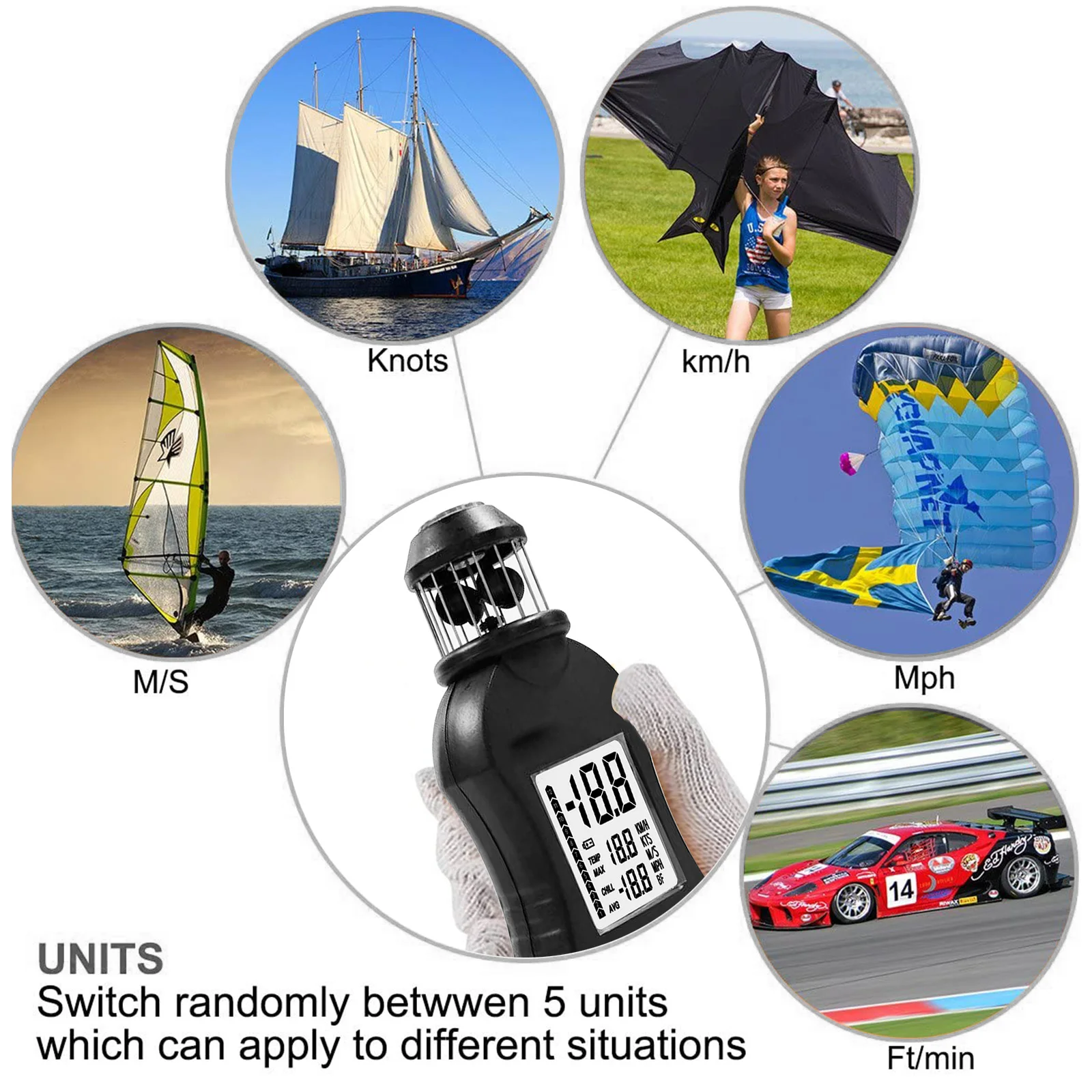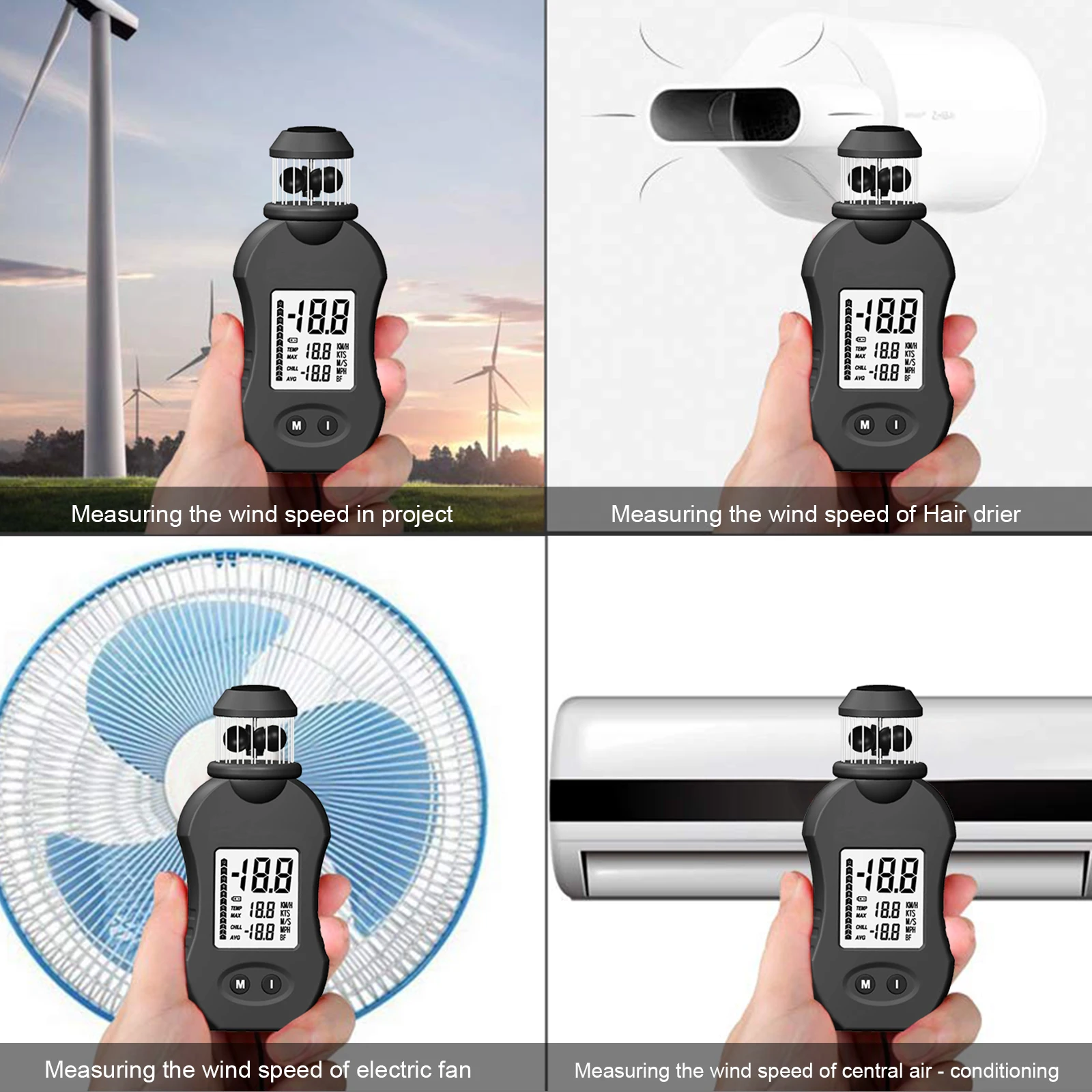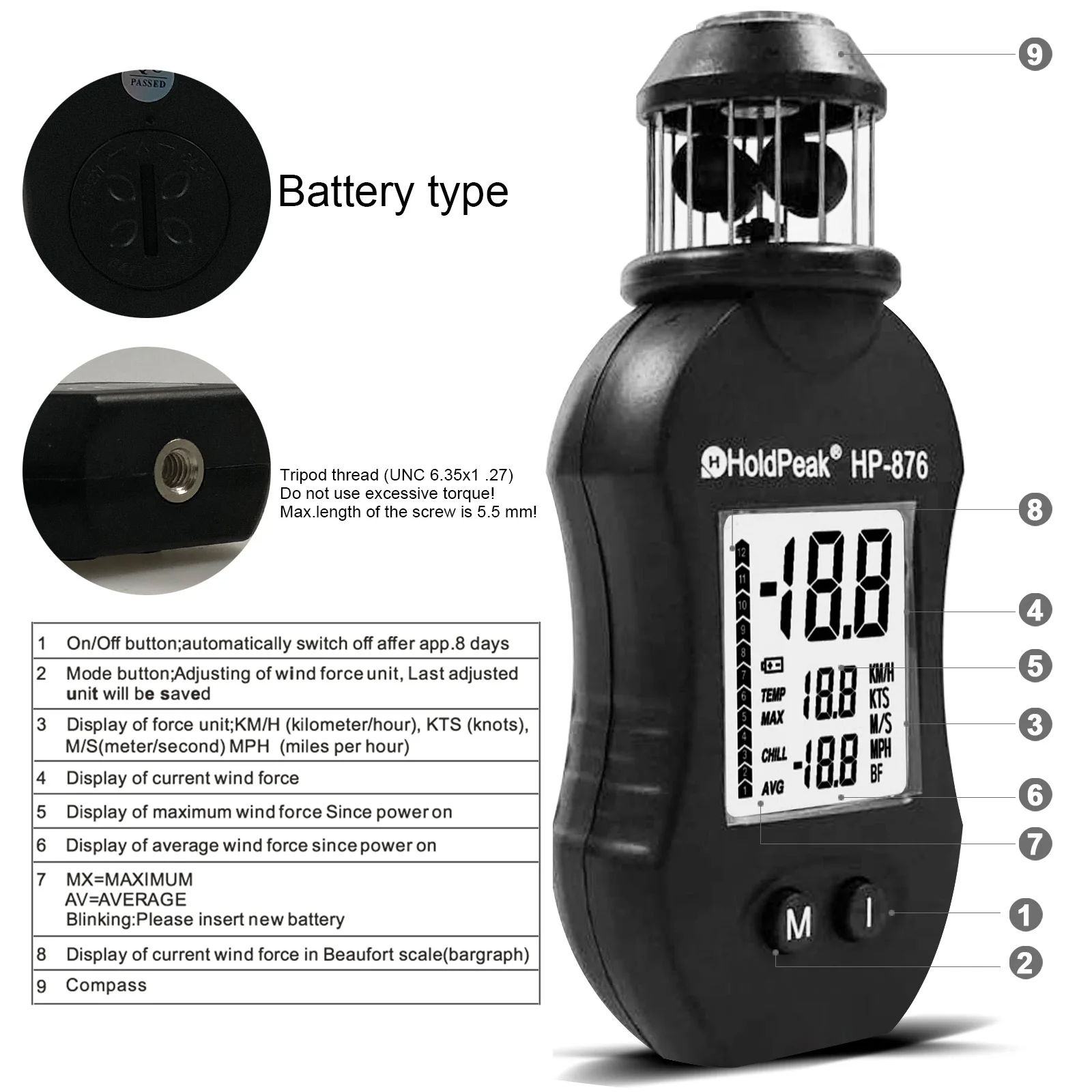 【Дизайн отверстия для штатива 】отверстие для штатива устанавливается в нижней части анемометра, чтобы держать Анемометр стабильным для измерения скорости ветра и освободить руки при измерении скорости ветра. Например, стрельбы или стрельбы. (Примечание: штатив в комплект не входит)