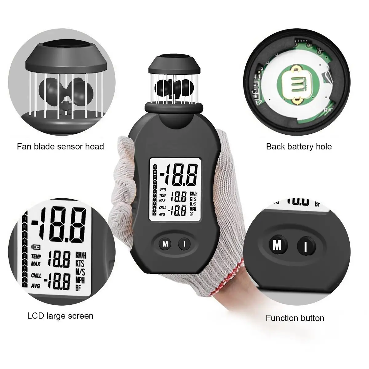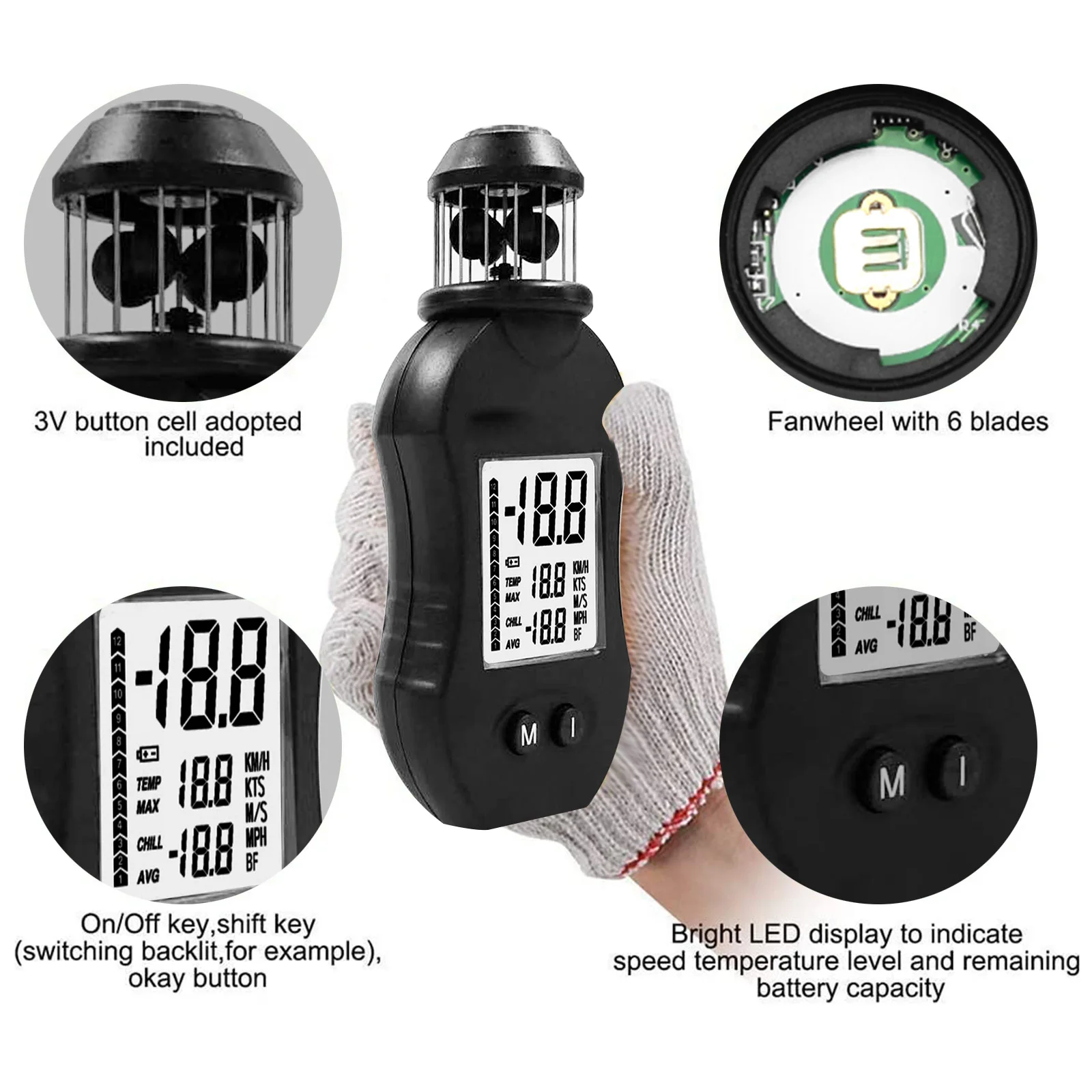 【Multifunction】Display: шкала Бофорта (столбчатую диаграмму), узлов, м/с, км/ч, миль в час); Скорость ветра: в настоящее время, максимальная и средняя; Диапазон скорости ветра: 0,7-42,0 м/с;. Подарок: Анемометр имеет компас сверху, чтобы определить направление ветра.
