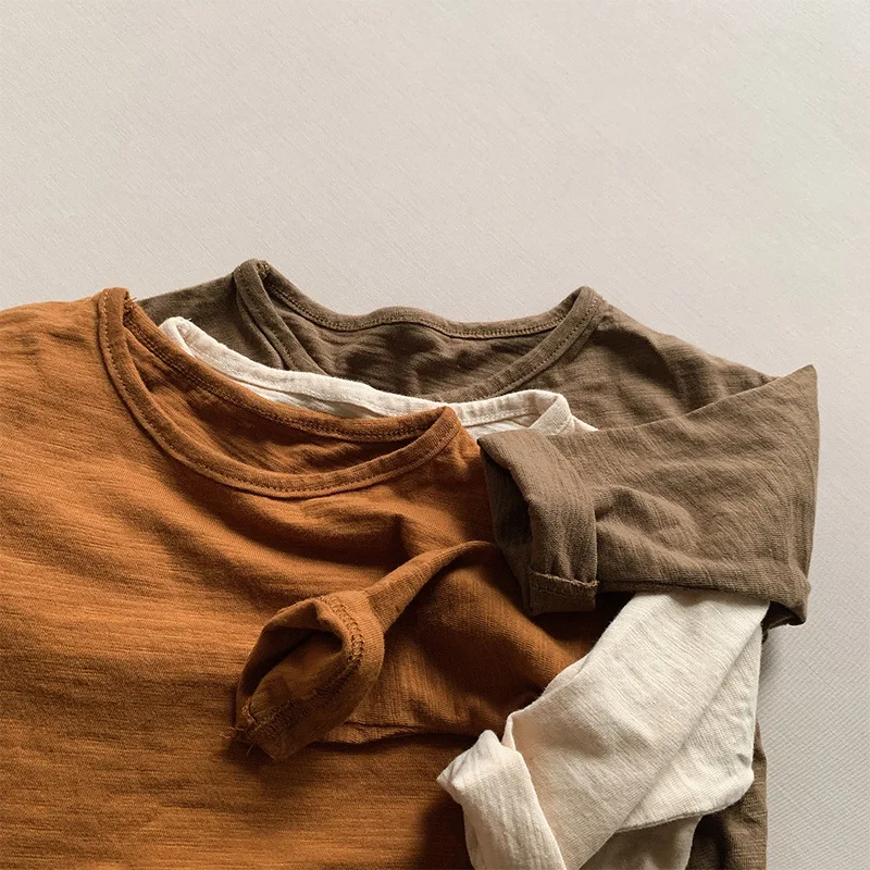 Осенние футболки с длинными рукавами для маленьких мальчиков однотонные хлопковые детские базовые Топы, удобная одежда для маленьких девочек корейские Детские универсальные футболки