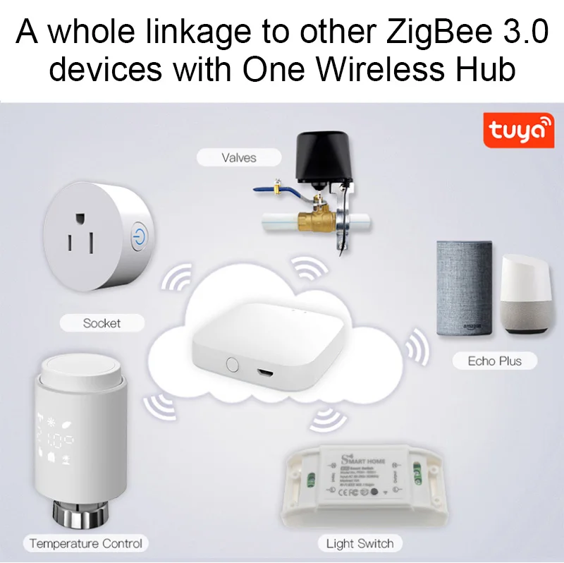2. Беспроводной шлюз Tuya ZigBee является обязательным: беспроводной концентратор ZigBee является обязательством, которое подключается к клапану многих других умных продуктов ZigBee и реализует всю связь ваших устройств умного дома. Просто добавьте свой шлюз в приложение, а затем добавьте привод радиатора к вашему шлюзу в приложении.