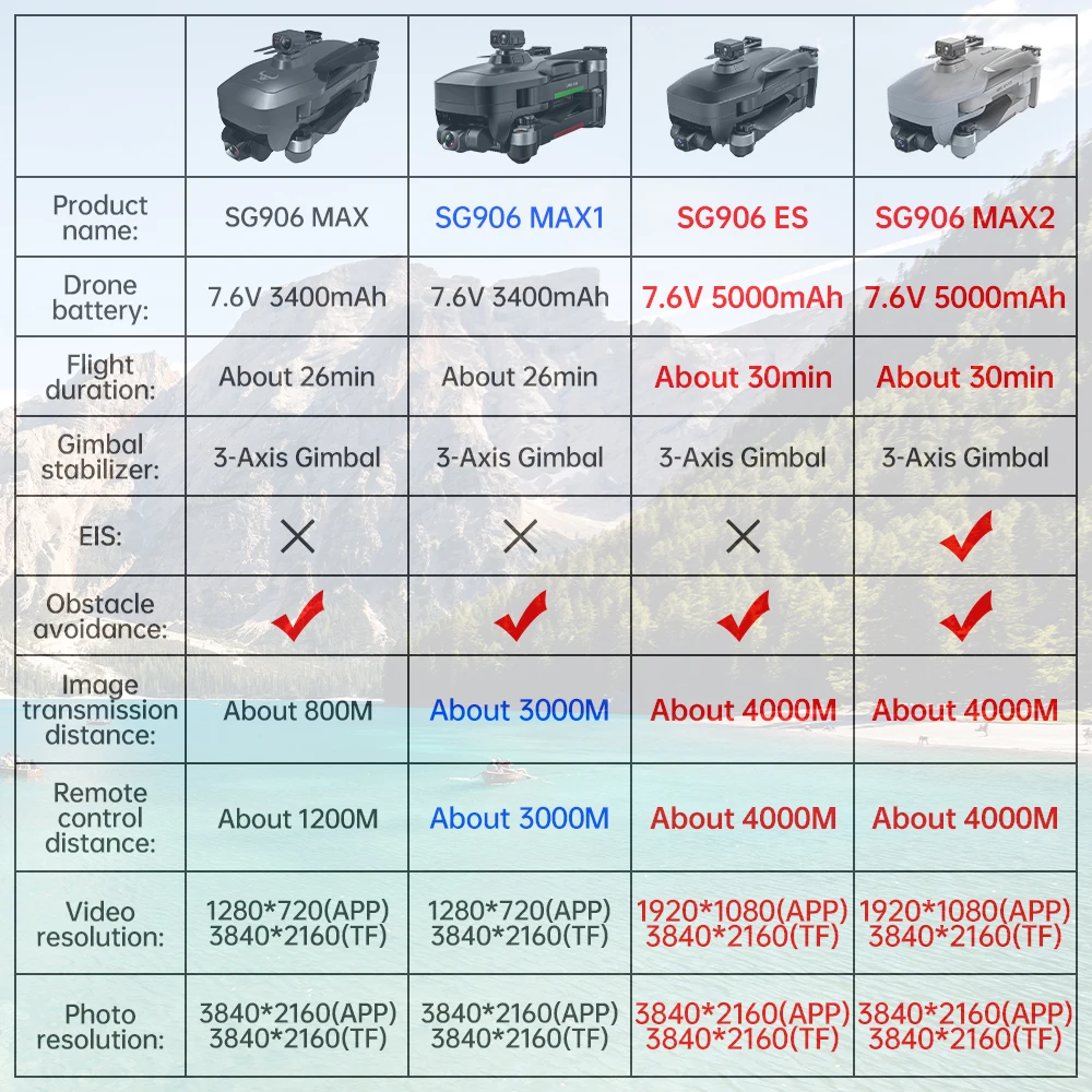 SG906 MAX2 (чип Ambarella) и SG906 MAX2-ES (чип Huawei HiSilicon) имеют одинаковую функцию, но поставщик чипов отличается1.Thers SG906 Max и SG906 Max1 SG906 Max2 версии, пожалуйста, проверьте его перед заказом, спасибо!2.SG906 MAX(UHD + EVO) является обновленной версией SG906 pro 2, она добавляет функцию, которая составляет 120 ° переднего препятствия.Особенности:SG906-MAX2 (BEAST 3E)