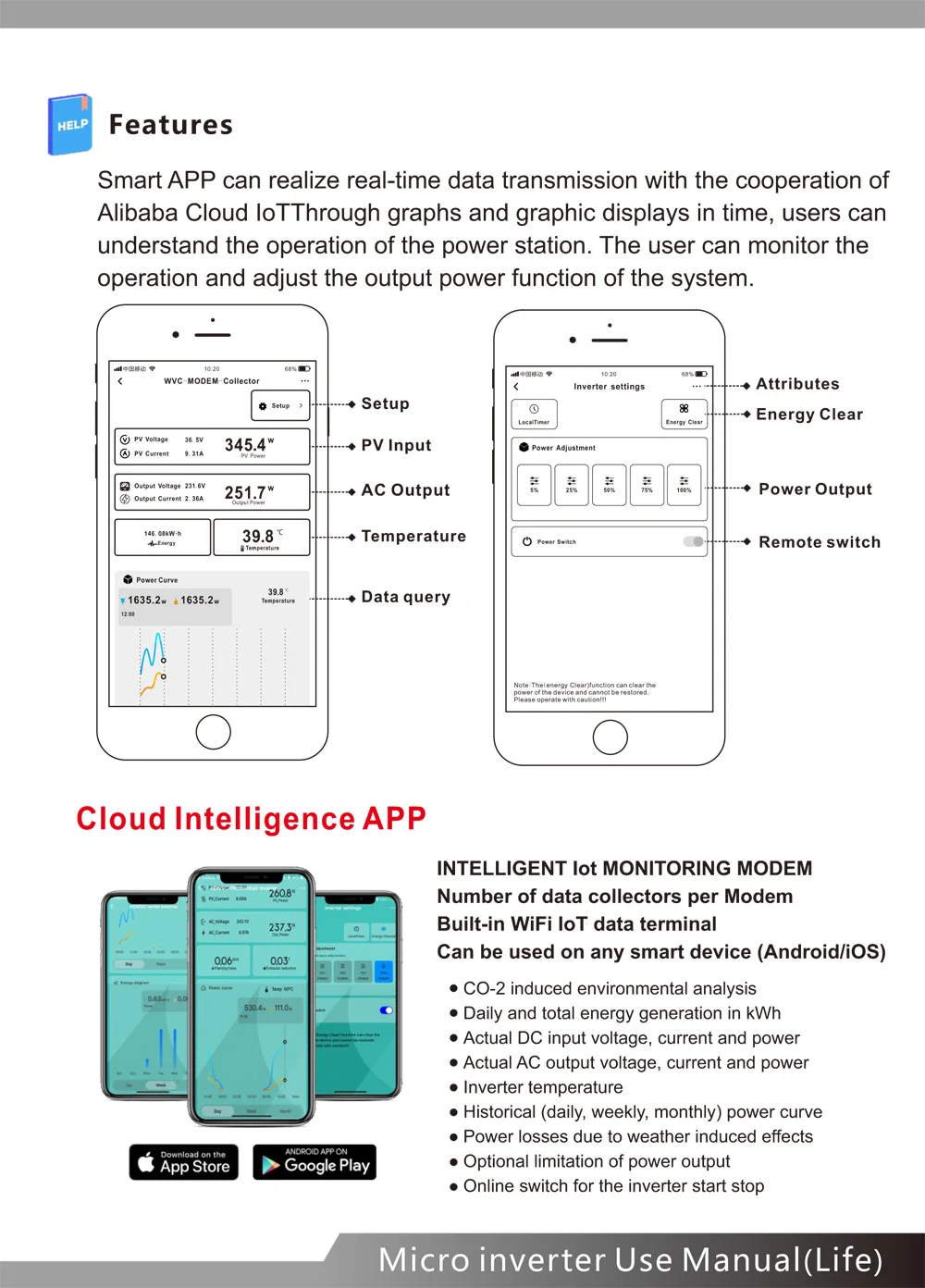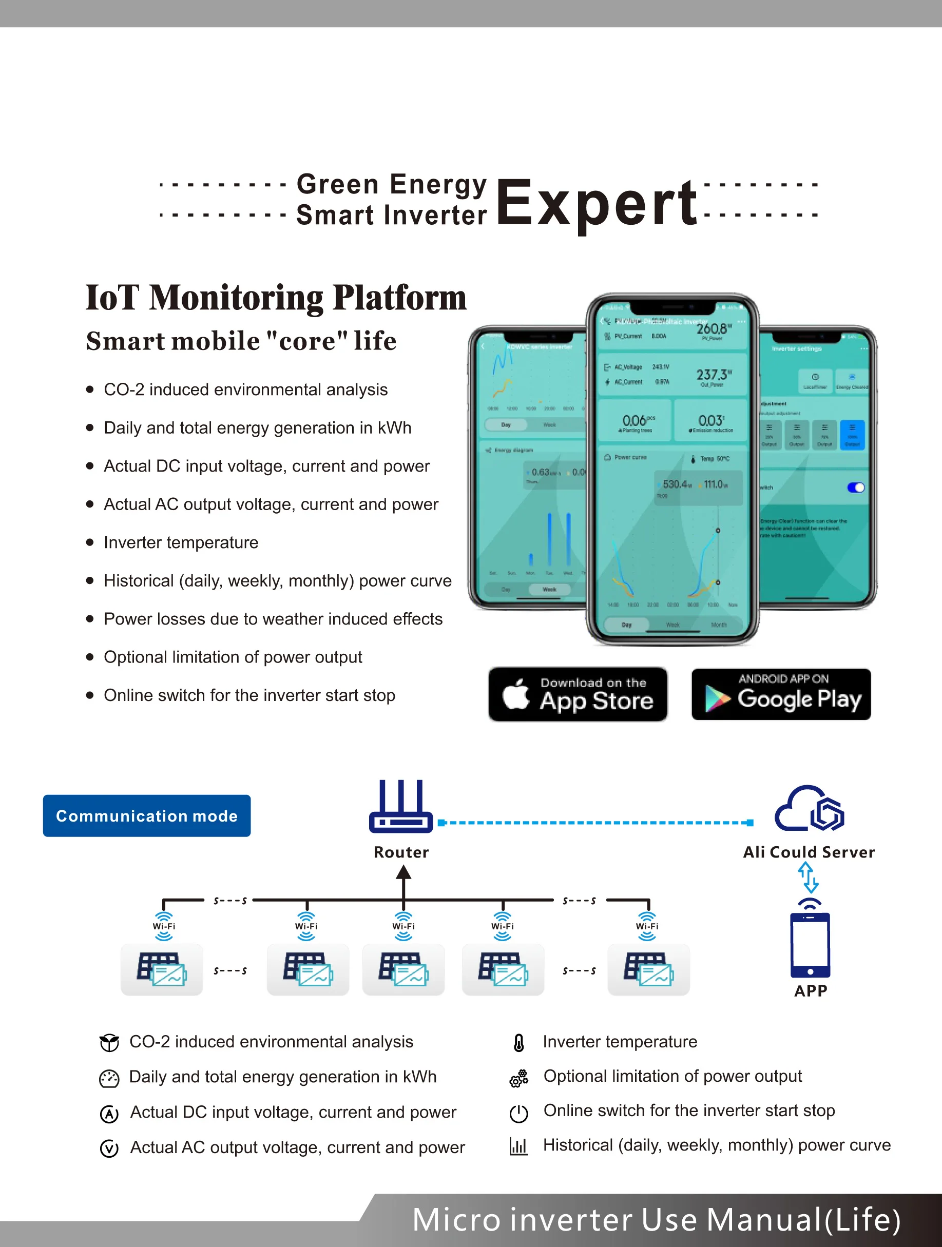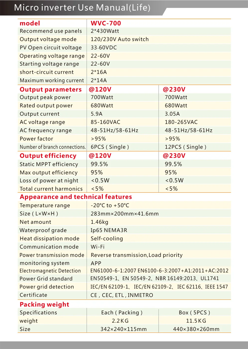 Микроинвертор WVC700W с использованием водонепроницаемой конструкции IP65, может эффективно предотвращать эрозию дождевой воды на поверхности, встроенная высокопроизводительная функция отслеживания максимальной мощности (MPPT), лучше отслеживать изменения солнечной яркости и контролировать различную выходную мощность, эффективно улавливать и собирать солнечный свет. Передача электрической энергии переменного тока с использованием технологии обратной передачи, является одной из наших запатентованных технологий, выходная мощность инвертора может обеспечить приоритетное использование нагрузки, дополнительное электричество в сетку, эффективное использование инвертора к излучаемой мощности, скорость передачи электроэнергии до 99%.