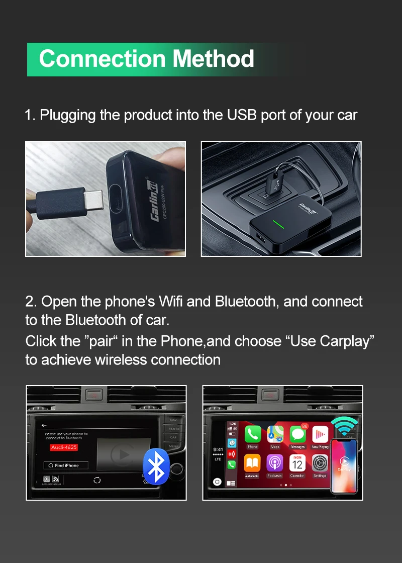 Продукт CarlinKit делает беспроводную CarPlay более легкой! Очень удобно использовать беспроводную CarPlay, попрощайтесь с кабелем передачи данных, беспроводная передача обеспечивает более удобное соединение. Легко подключается к вашему iPhone каждый раз, когда вы попадаете в машину, делает вашу жизнь вождения более легкой.