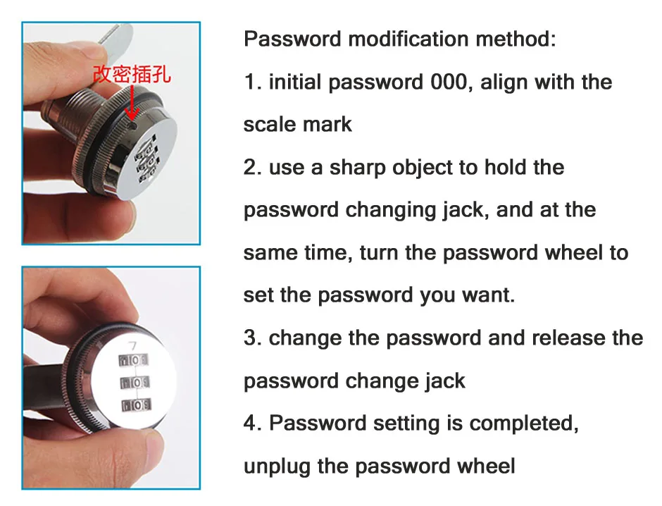 1 there is a password change hole below the lock. In the open state, use a small stick to top the hole, do not release it.