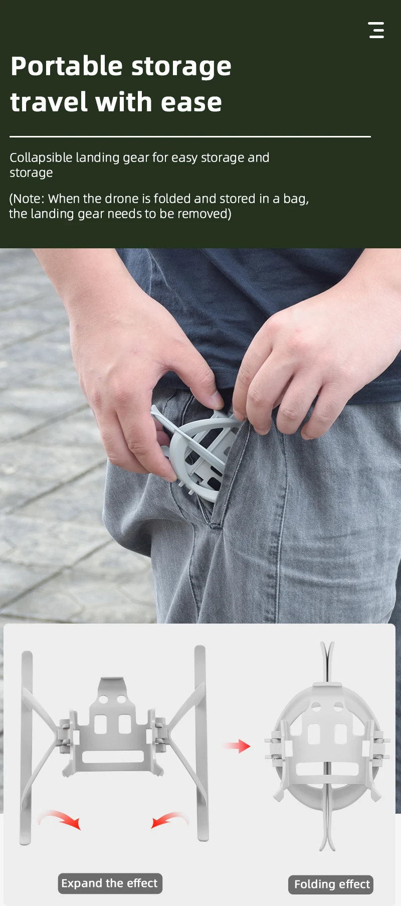 Когда Дрон складывается и хранится в сумке, посадочное устройство необходимо снять
