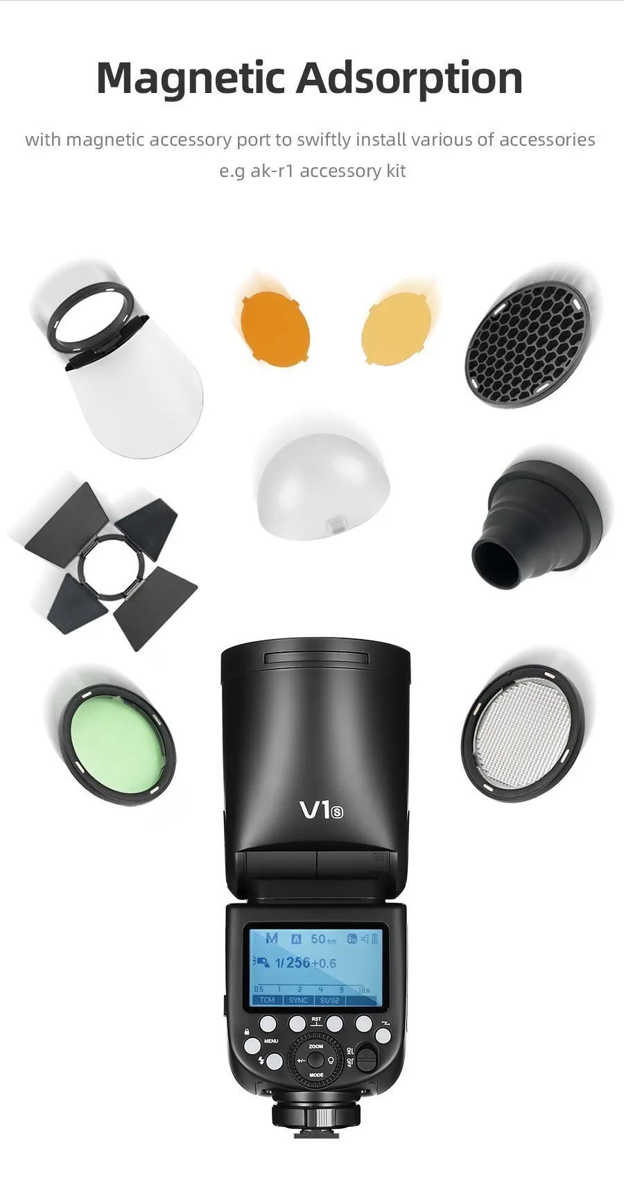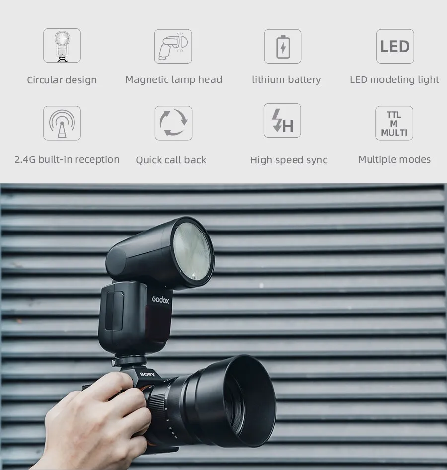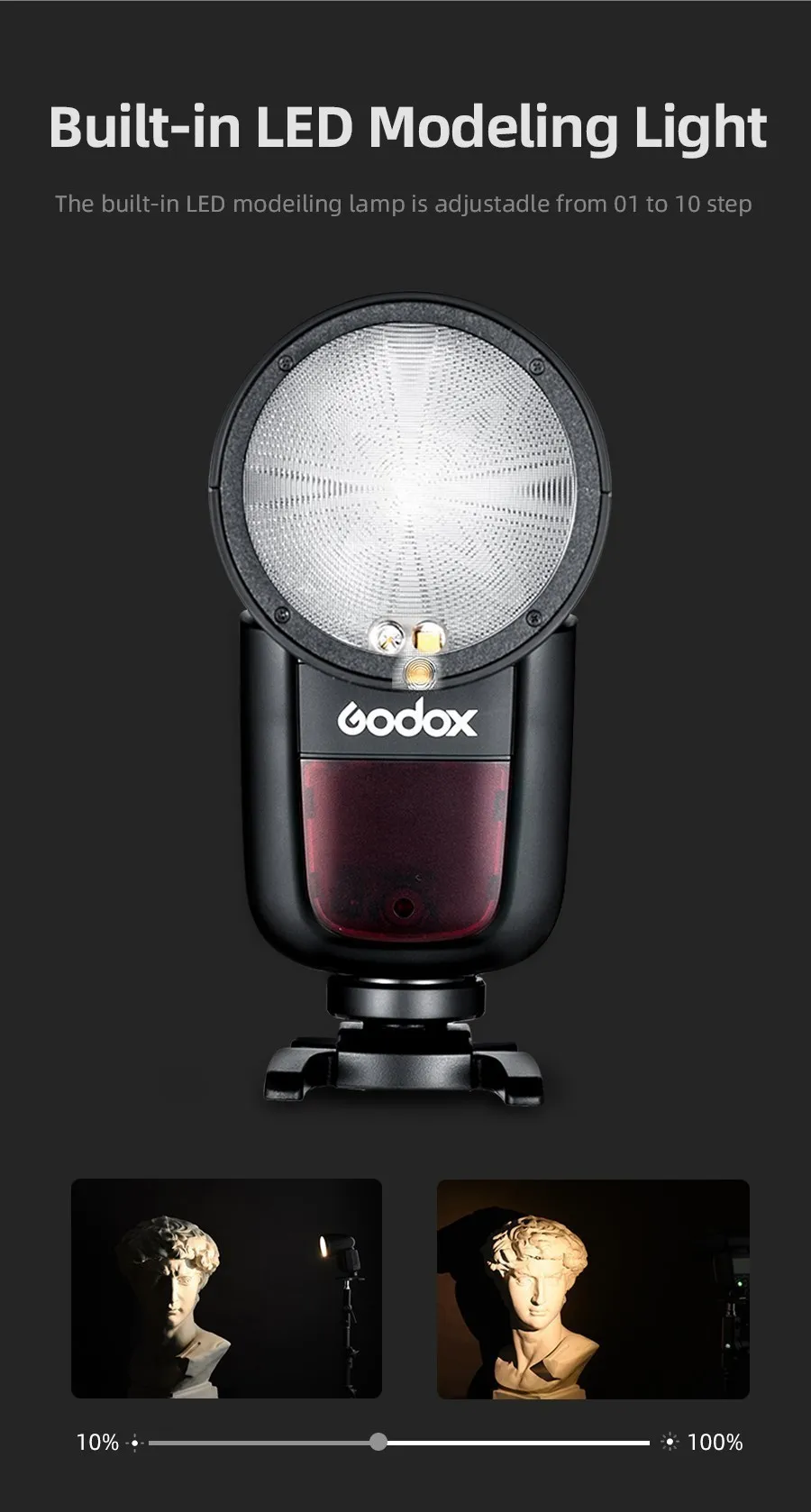 Godox V1 оснащен круглой головкой вспышки, чтобы предложить студийный мягкий и ровный светильник.