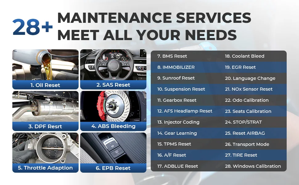 ④28+ maintenance services such as Oil Reset, EPB Reset, DPF, Gear Learning, Suspension Reset, Throttle Adaption, Odo Calibration, Windows Calibration and more.