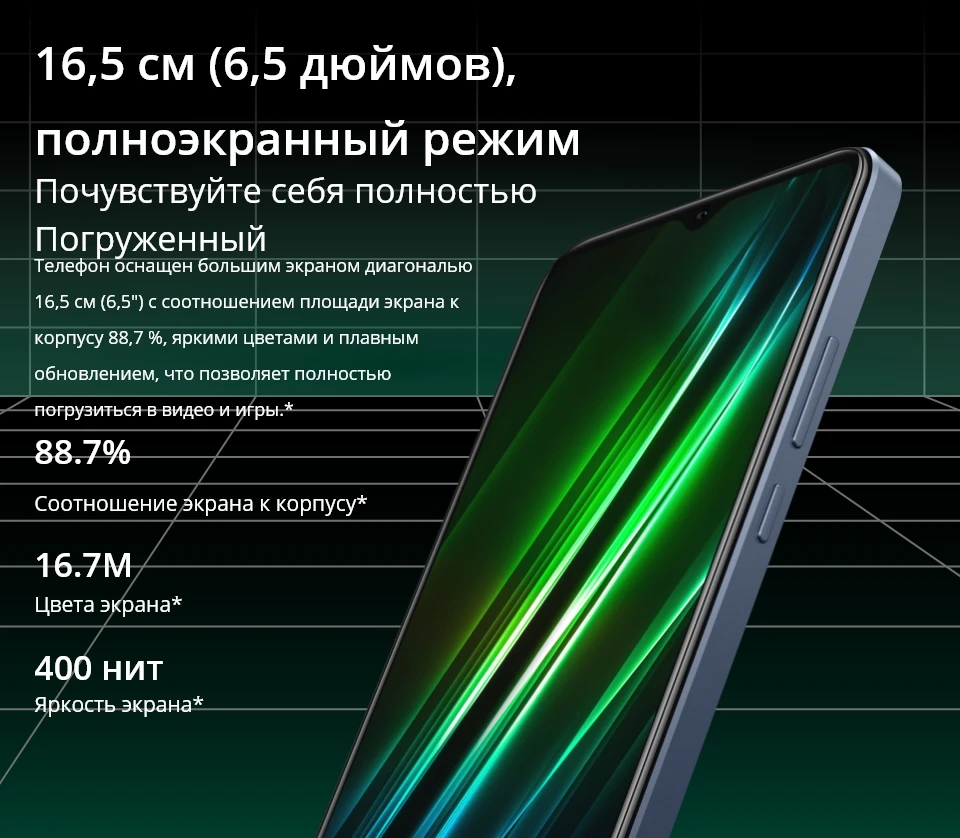 Экран ---------- Большой дисплей 16,5 см (6,5 ''), Соотношение экрана к корпусу: 88,7%, Яркость экрана: 400 нит (тип.), Цвета экрана: 16,7 млн.